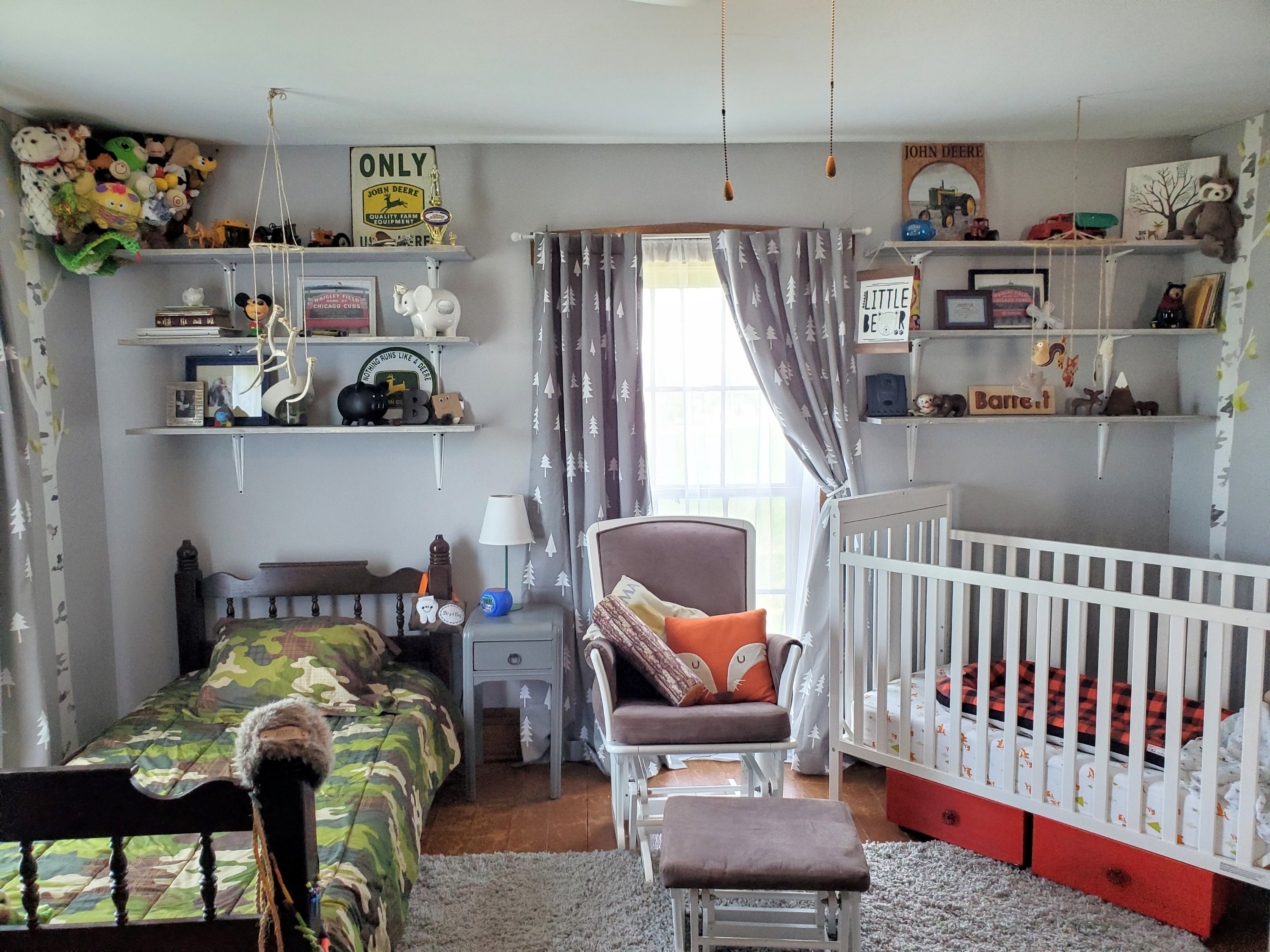 I’ve worked on it for a year and I can finally say it’s as done as it’s getting right now. 🤣 When we moved to this house a year ago and I was pregnant, we decided the boys would share a room. This way I could have an office, and the office would double as a play room/workout room, so that kids could be in there while I worked if needed. I also knew that I wanted an outdoors-y theme that could work for both a baby and a young boy. Brantley already had a farm theme as a baby, with many pieces we wanted to incorporate, and he asked for camo bedding in his new room. If you’ve been here before, you also know that when we moved to this house it needed a lot of work. A lot. We ripped carpet out of this room, added electrical outlets and a light fixture, painted… and we still have more to do…eventually. But for now, here it is!