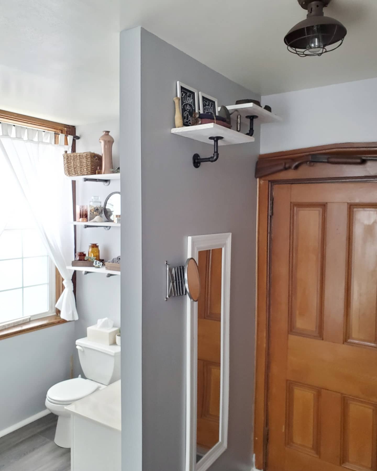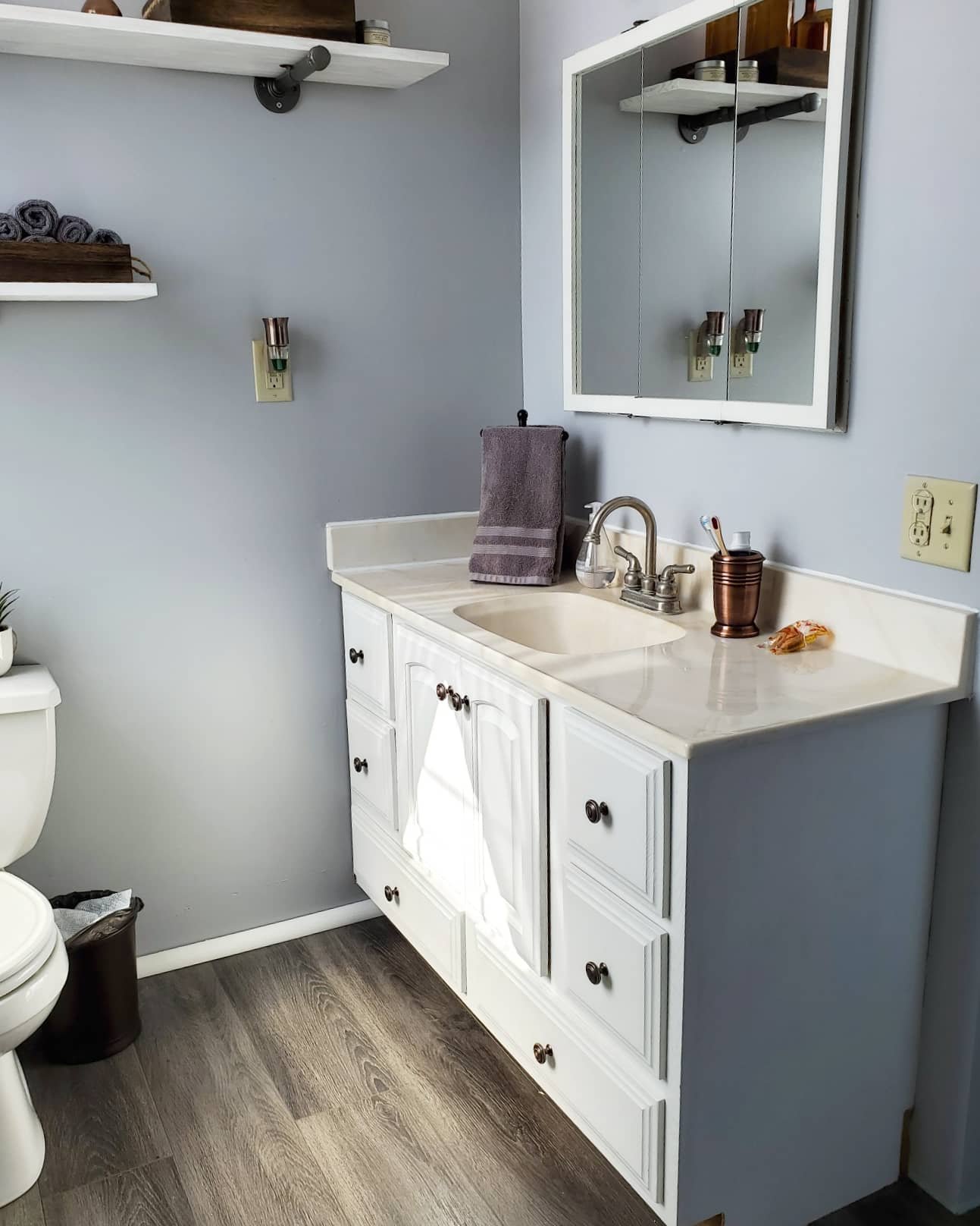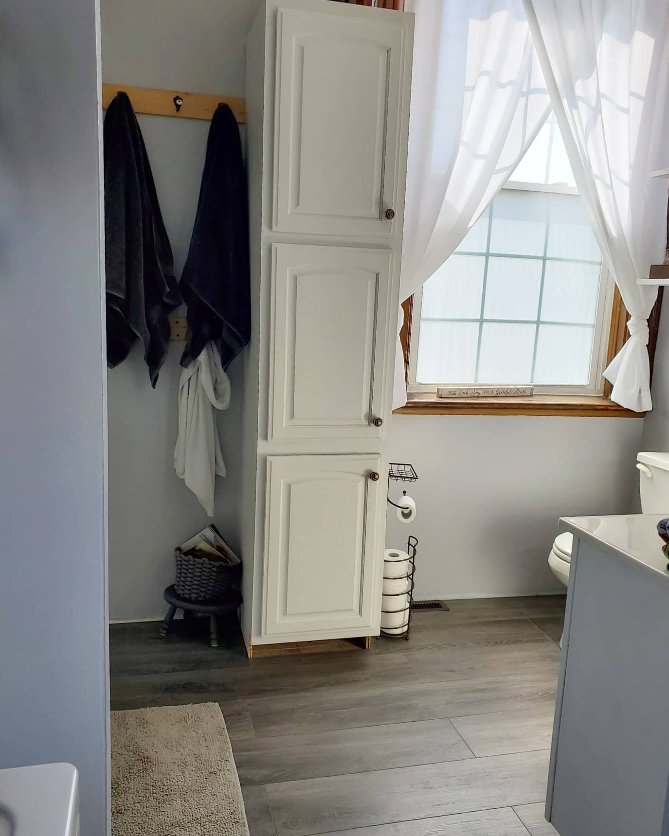 I thought we were going to live with the 85% bathroom update for a while. But we got a little shove to take it to 98% done now. 🤣 What this means is that we redid the flooring! Yay! And we added a mirror and a couple more custom shelves in the laundry room.