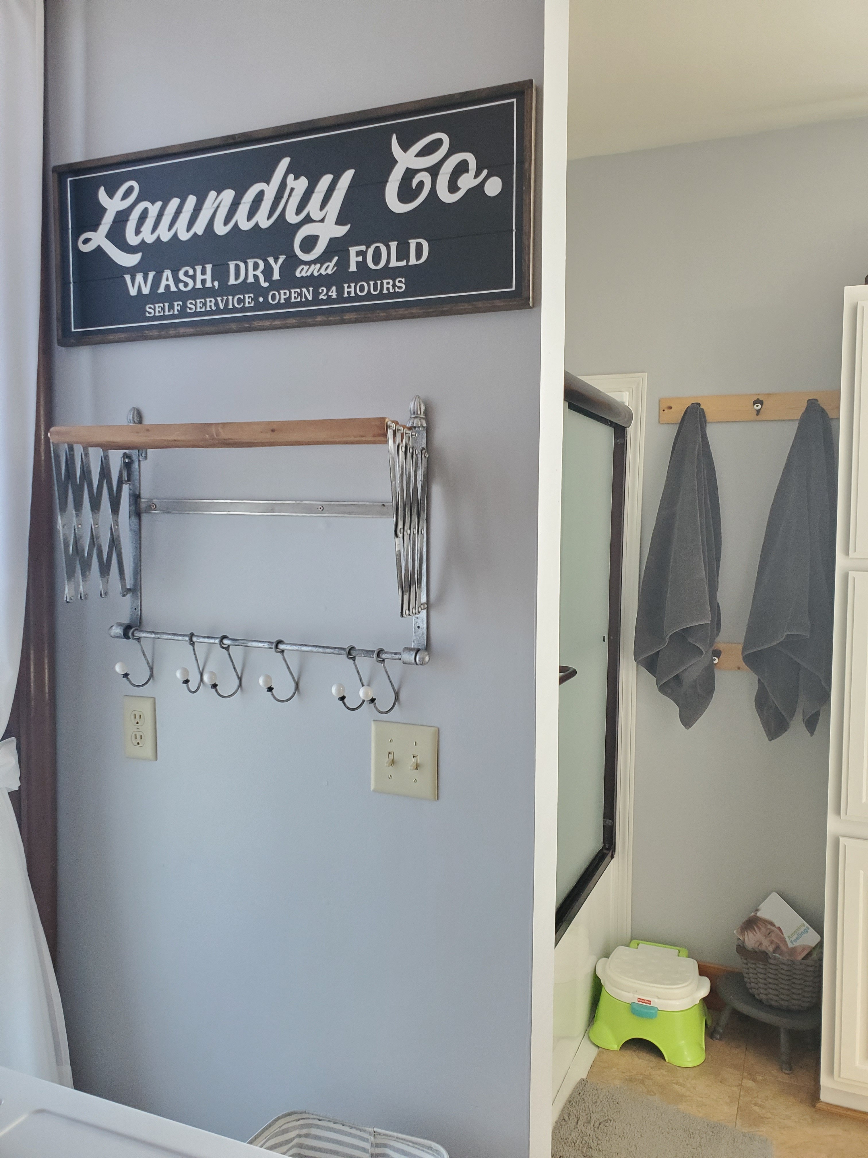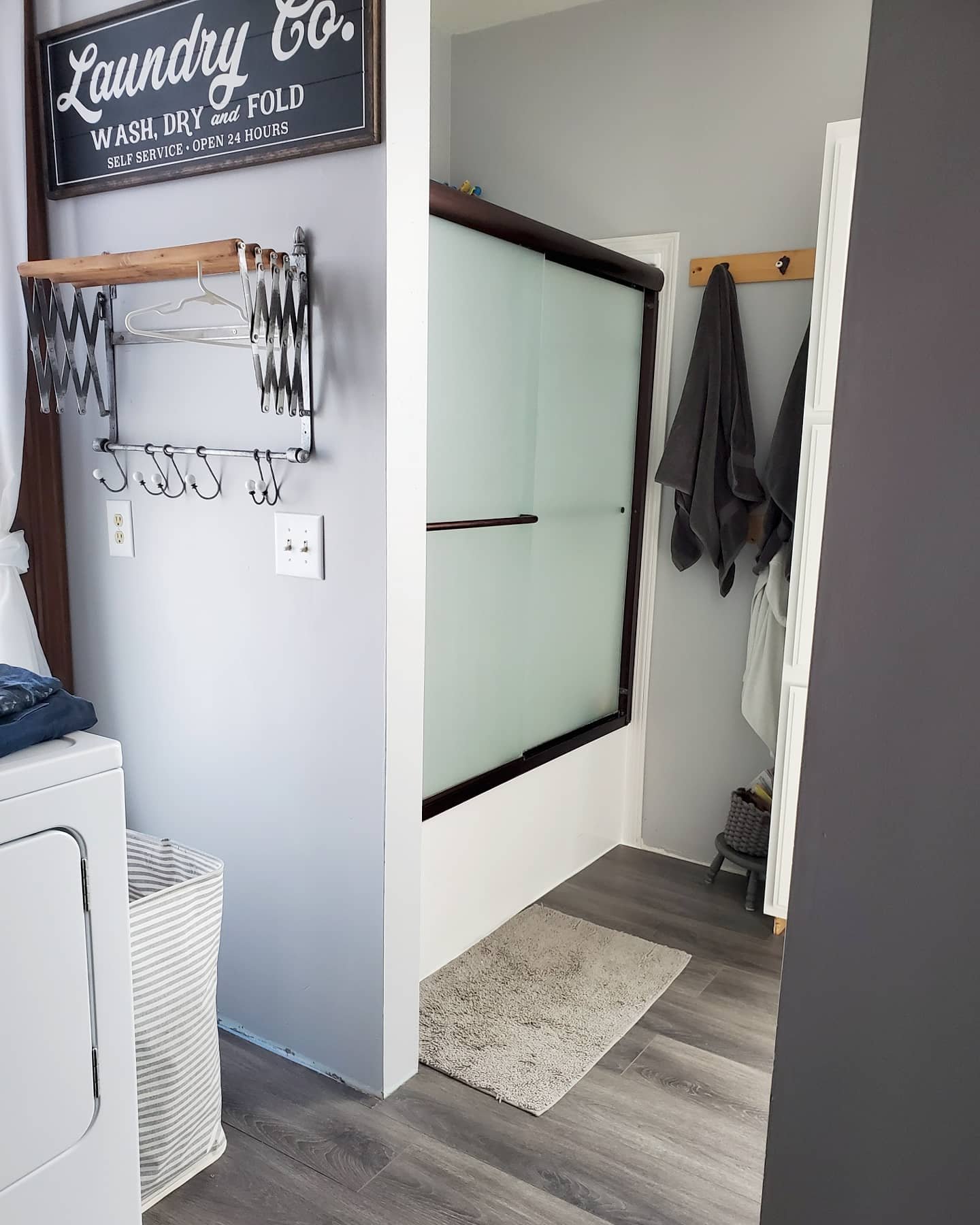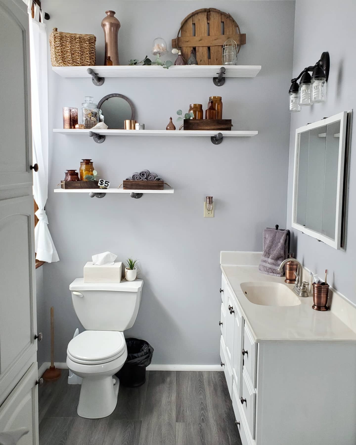 I thought we were going to live with the 85% bathroom update for a while. But we got a little shove to take it to 98% done now. 🤣 What this means is that we redid the flooring! Yay! And we added a mirror and a couple more custom shelves in the laundry room.
