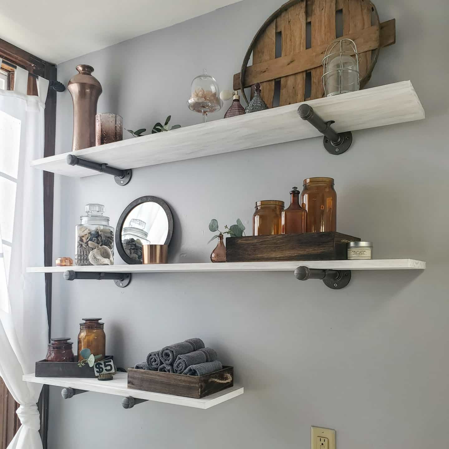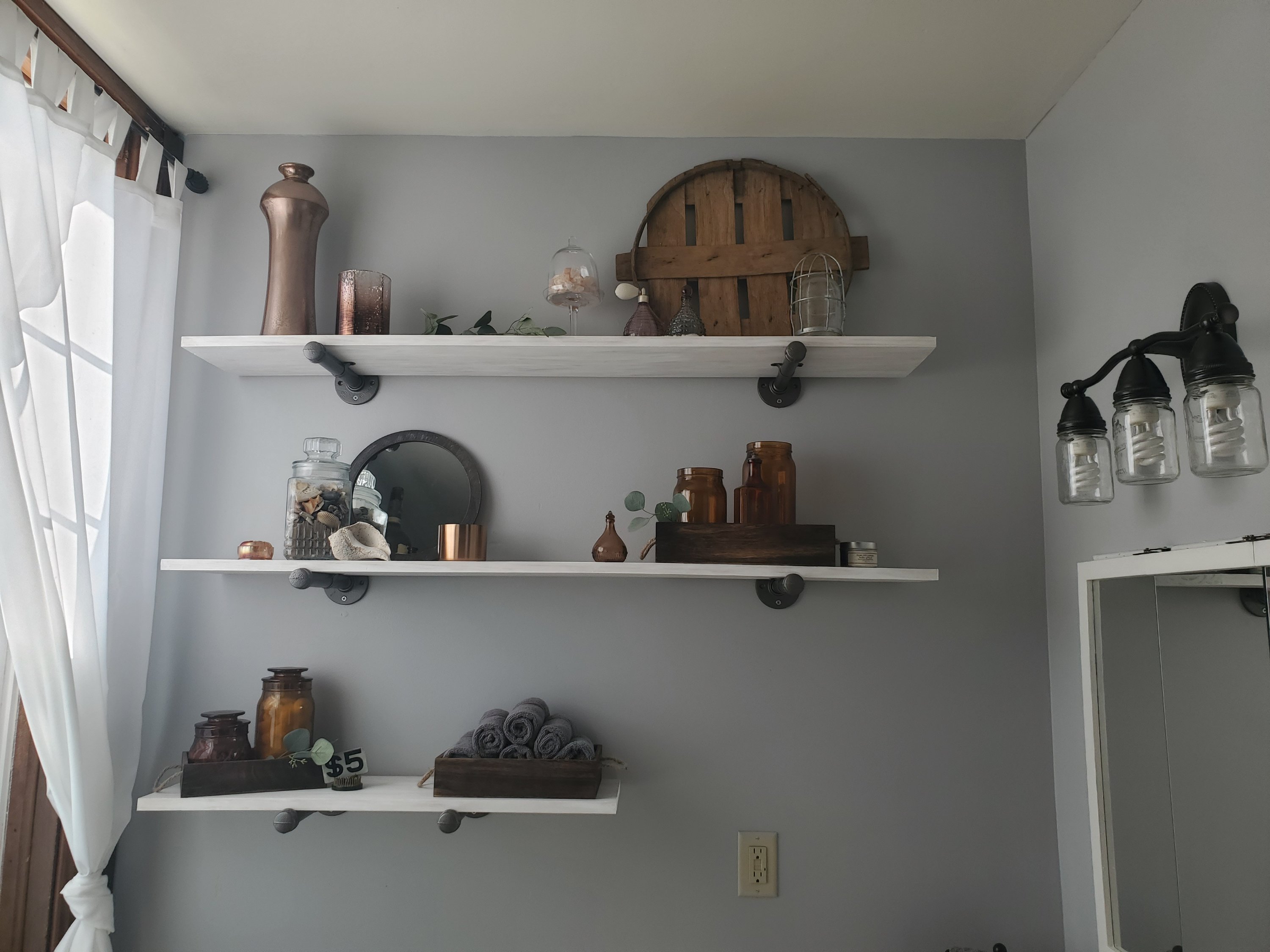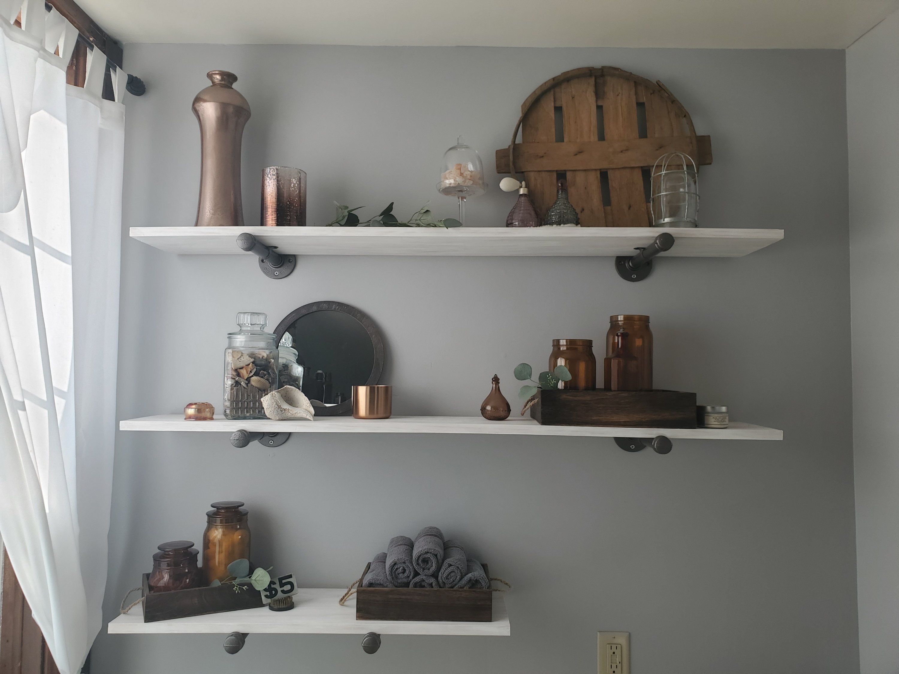 We also made the shelves ourselves and hand “grayed” the boards by smearing white paint with fingers. Tedious but so worth it. The brackets are plumbing hardware and can be found at Mendards. We painted the parts with a light oil rubbed bronze spray paint.