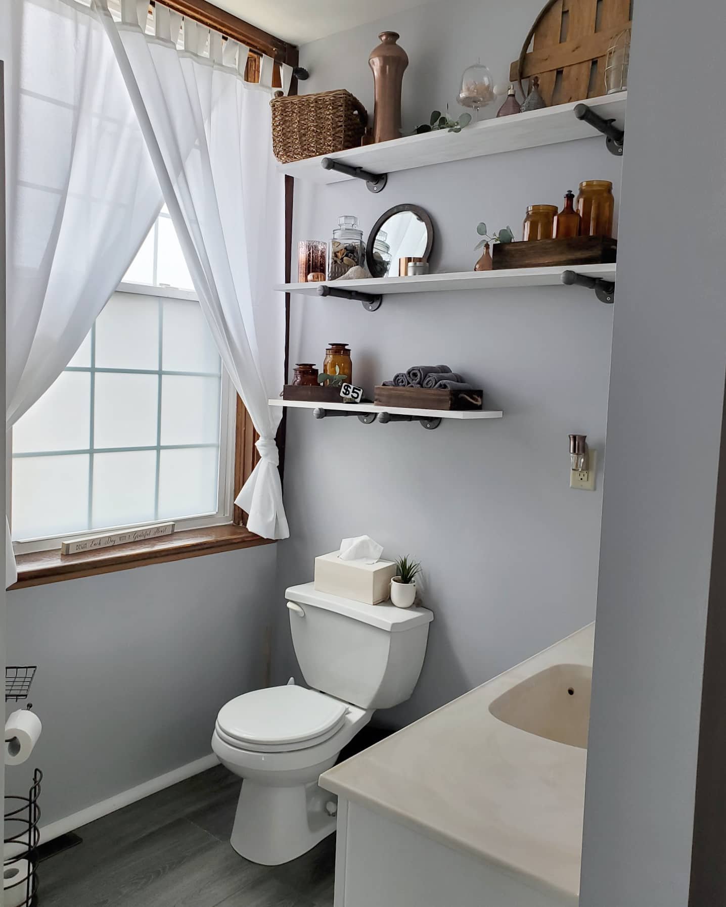 All on a budget for a quick fix up. We did add a new shower, as ours was a walk in when we bought the house and we needed a tub for the kids. Paint and curtains, and especially shelving, make a huge, but affordable difference!