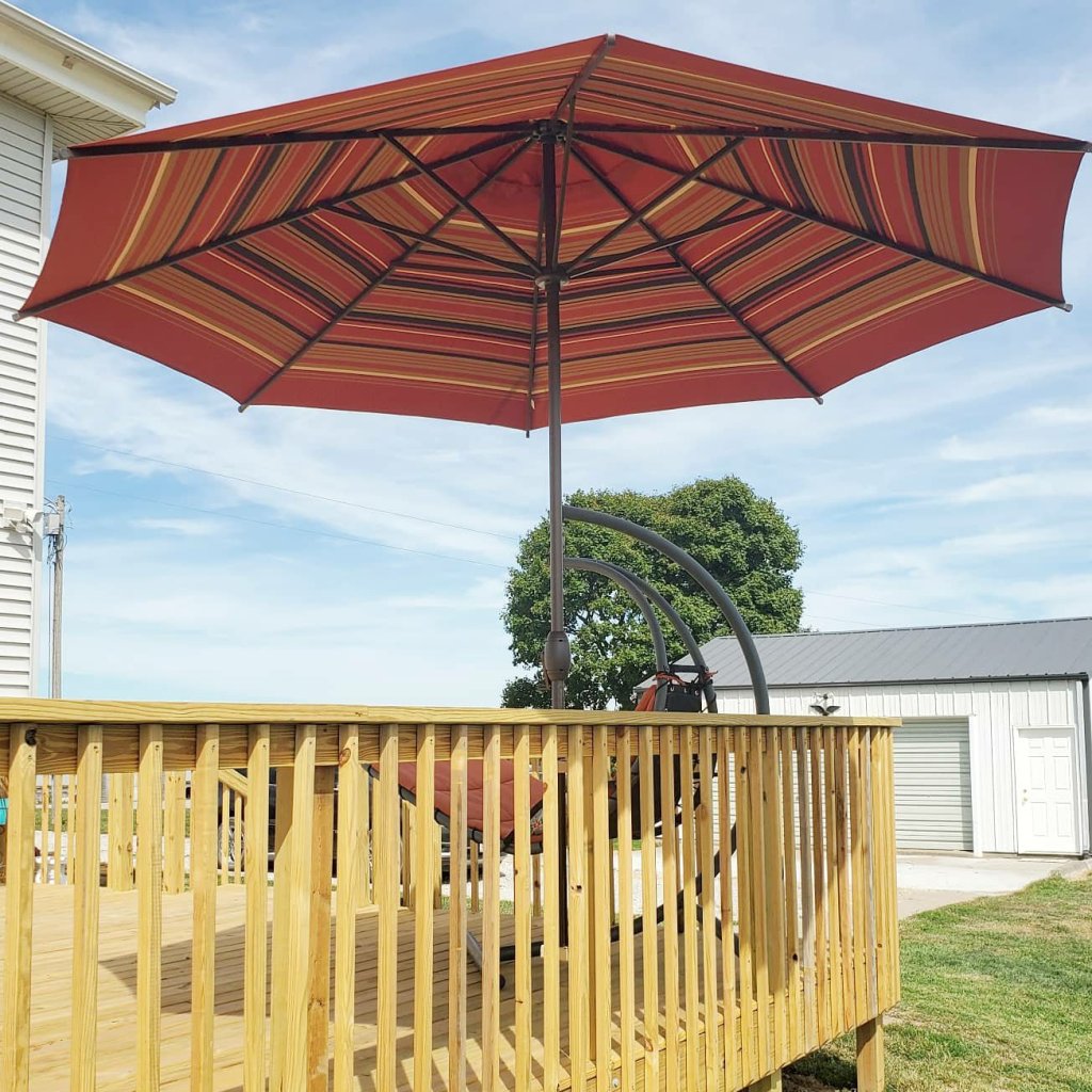 My favorite umbrellas?! From Abba Patio! (You can use code La10 on your order with them too!) The 11 foot red stripe is gorgeous! And so easy to use. We custom installed it with brackets we made, but it can go on a table or a base as well. This keep it so much cooler in the shaded areas!!