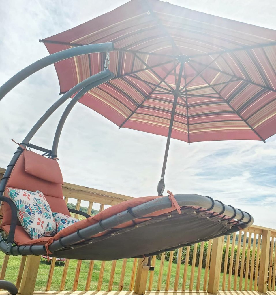 One more cozy add is lighting and sound. This can be super simple too. My lanterns are all inexpensive and have solar lights in them. We also added this umbrella light from Brilliant Evolution recently and it adds such a beautiful glow in the evening! You can use code JESSICA15OFF on their lighting too!