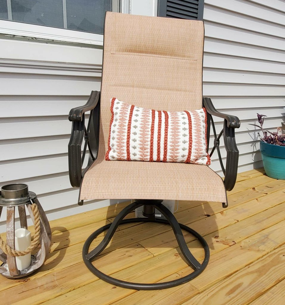 Some cushions and Walmart and Dollar General, but old, and the two darker green are new from Target Dollar Spot. Scotch Guard them to keep them longer, and I take in or put in a deck box when weather is bad. 😉
