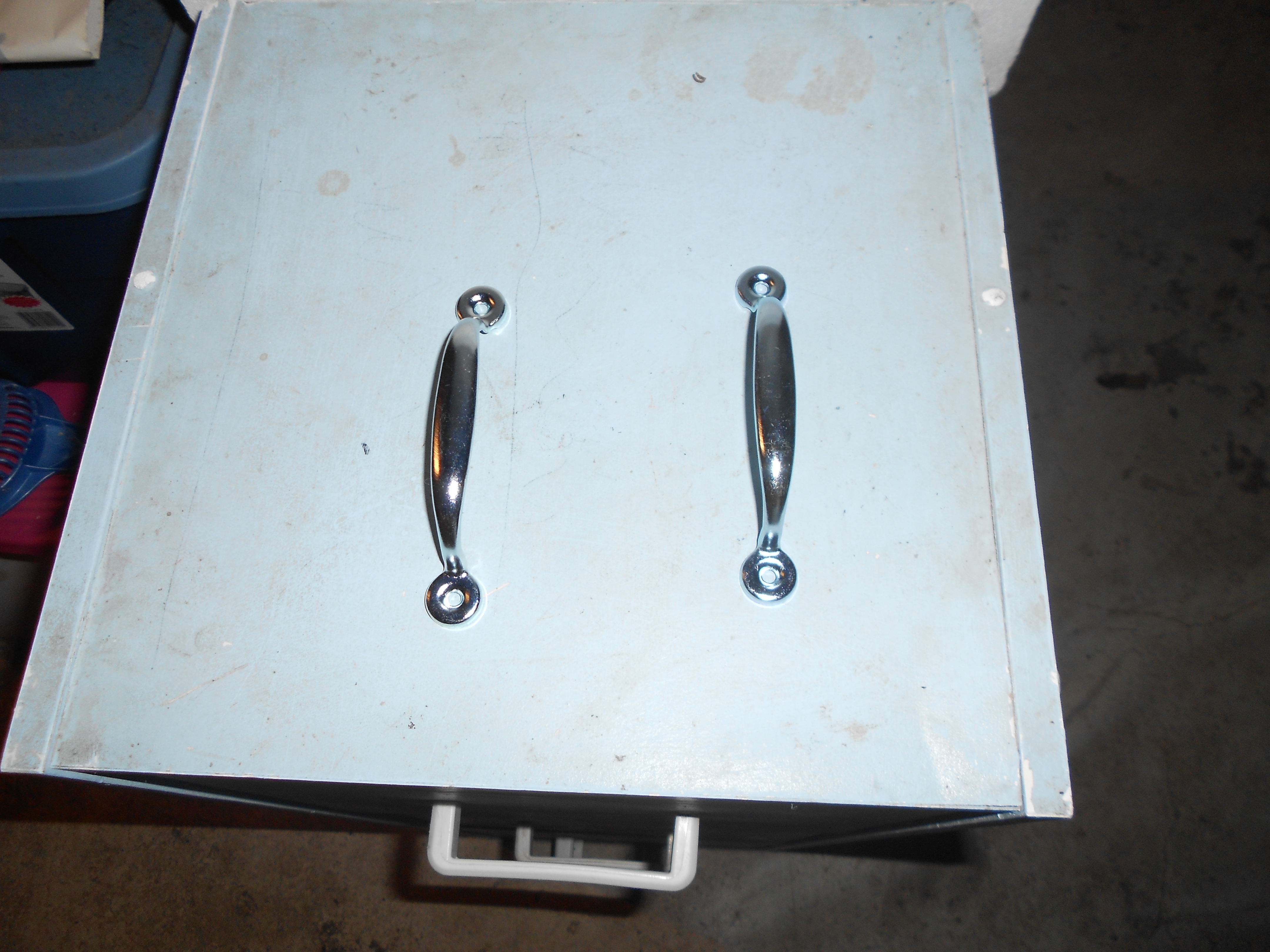 I sanded it down and taped off the top from the bottom. I painted the bottom of the table in a satin cream color. I then painted the top in a black chalkboard paint. To finish it off I roughed up the edges to give it a worn look. I put the same handle back on rather than replacing this one because I thought it matched the style well. Overall I think it turned out adorably. What do you think? 🙂