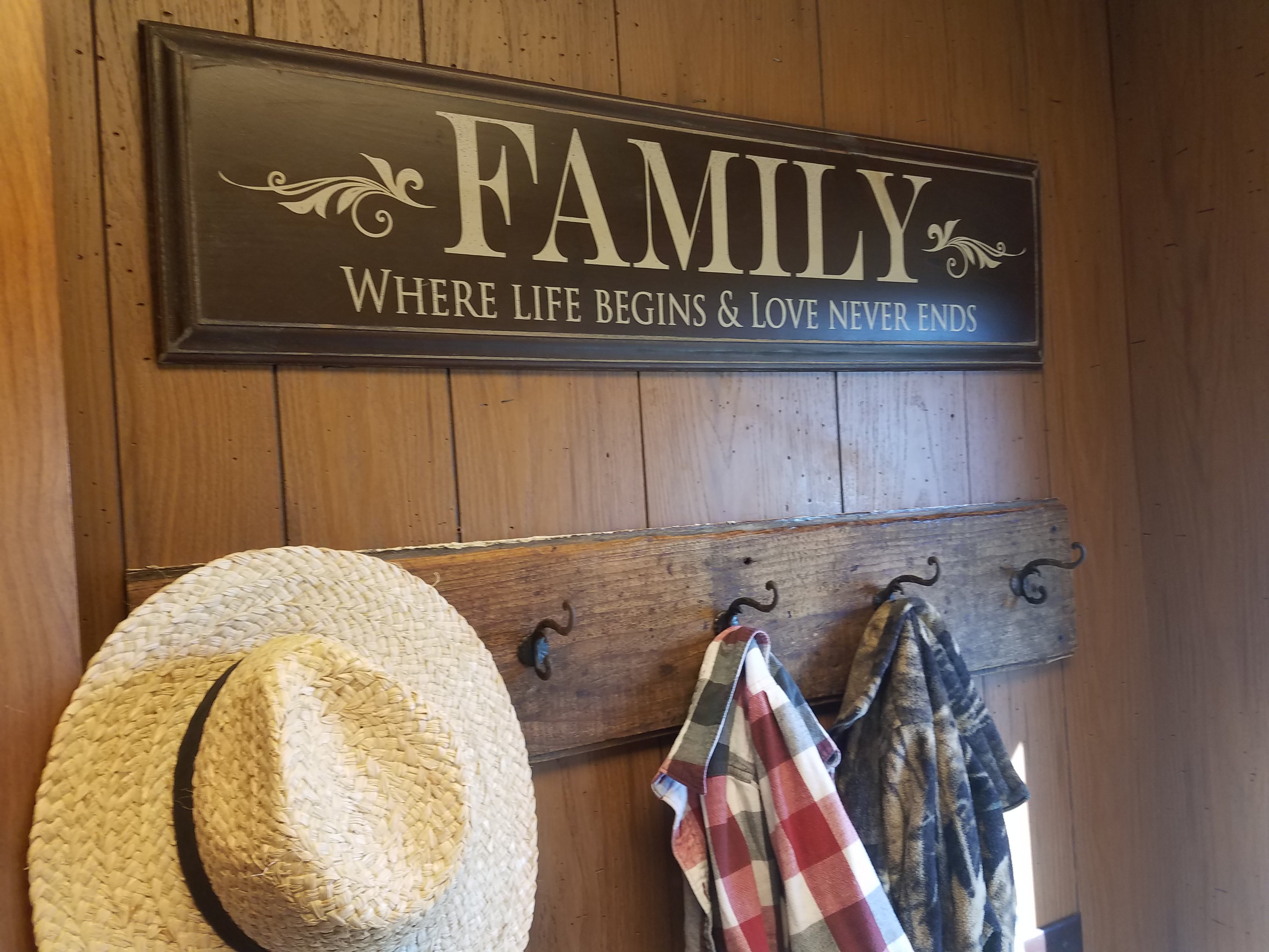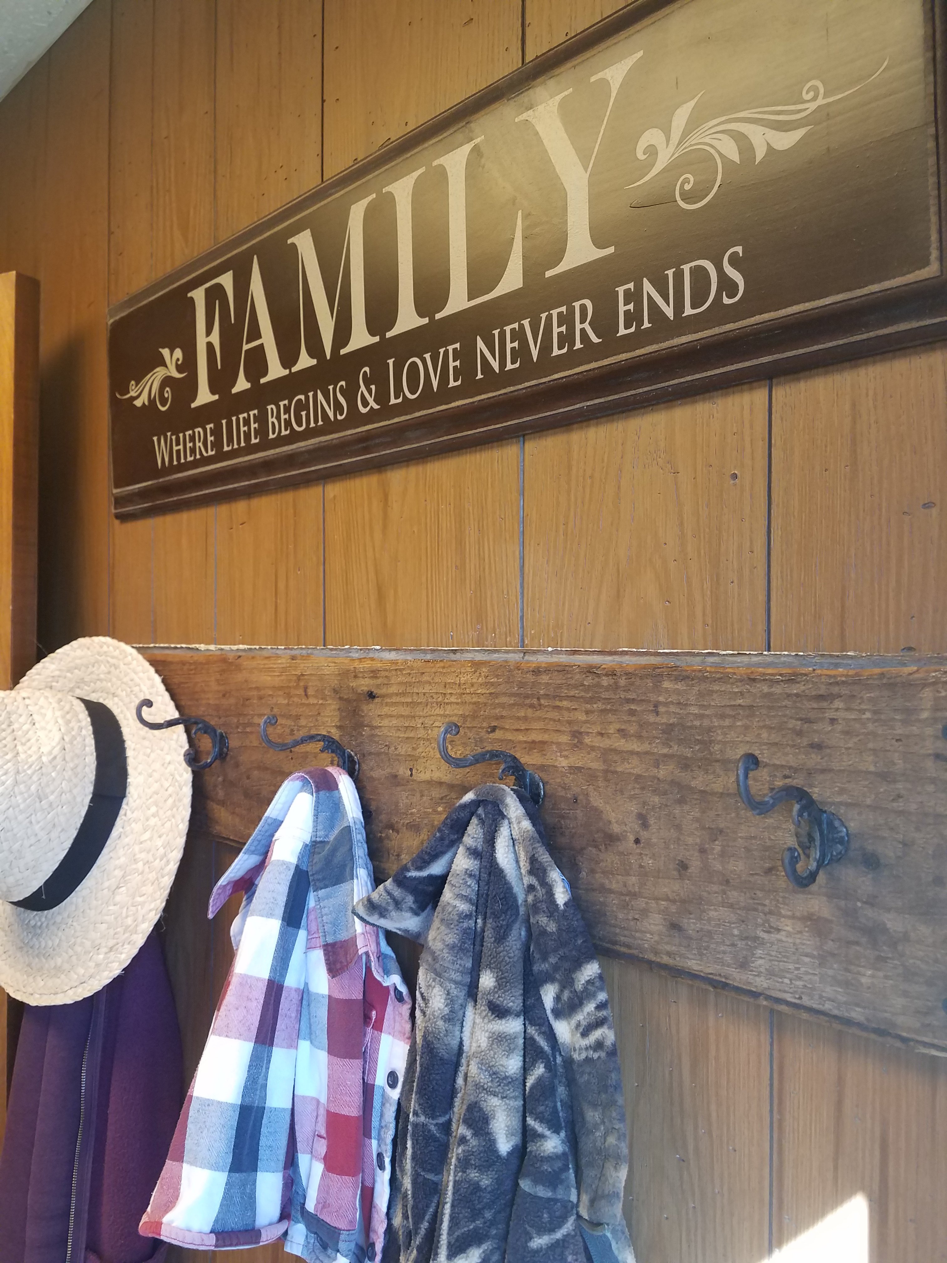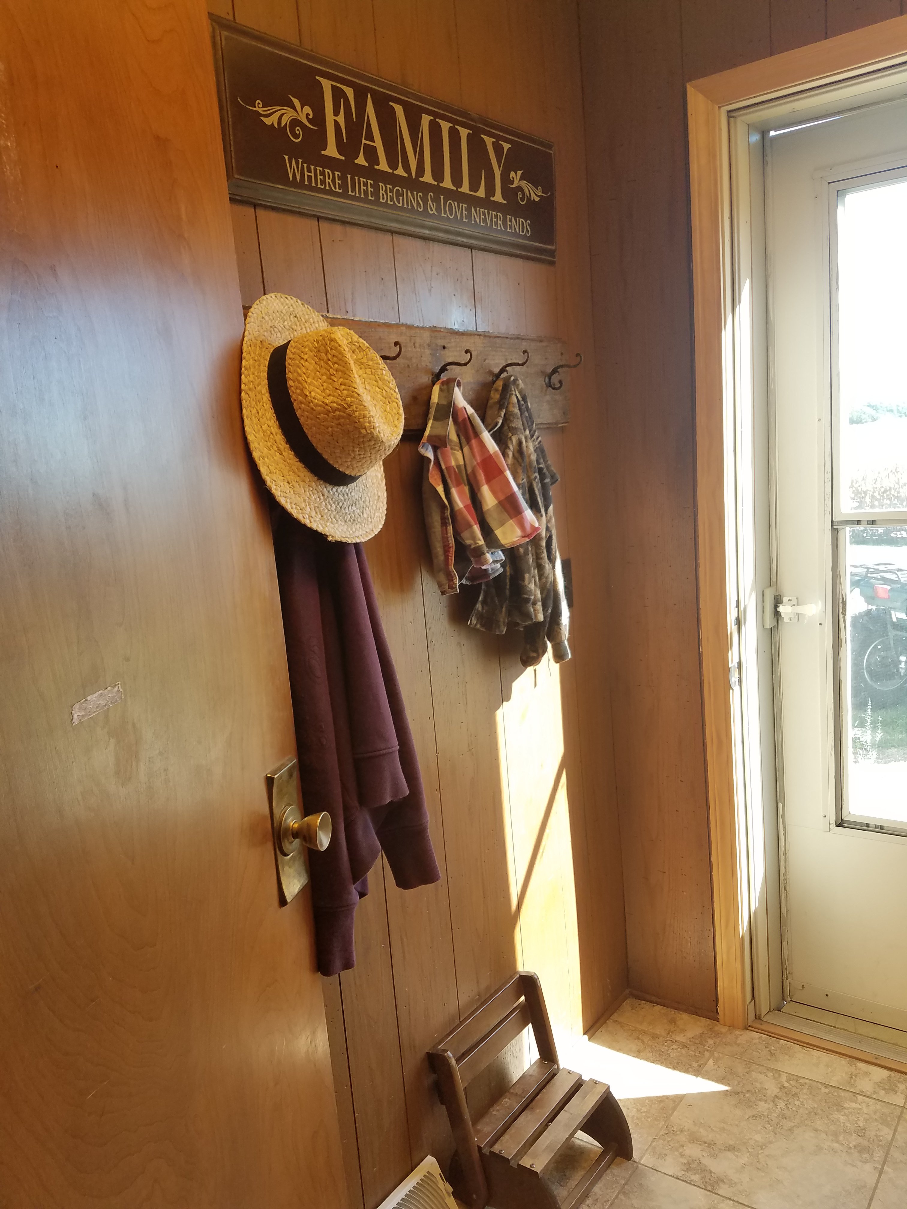 Do you call your door area an entryway or a mudroom? Or a foyer? Sometimes we even just call it “by the backdoor” 😝. For us, this is one of the most heavily used areas of our home. But it is ug-ly. Think 70’s dark faux wood paneling floor to ceiling. Yeah. So this area has been on my re-do-it radar since we moved. I hope to at least paint the paneling, if not possibly remove it all someday. There is even a little mudroom sink next to the closet. Handy if you are a farmer, but we aren’t farmers. So I plan to remove it and make the closet double it’s current width. The extra cost storage will be much appreciated. And here I’m thinking sliding barn door! But all of this is way ahead of where I’m at today. I just wanted some coat hooks. That’s it, simple request. They had 2. Two measly hooks. They were skinny, pokey, ugly little hooks, that weren’t even hung at the same height. Starting to envision just how ugly? So we made a coat rack. Bear with me, I know the paneling is still ugly! Have some vision, and try to focus on the coat rack!