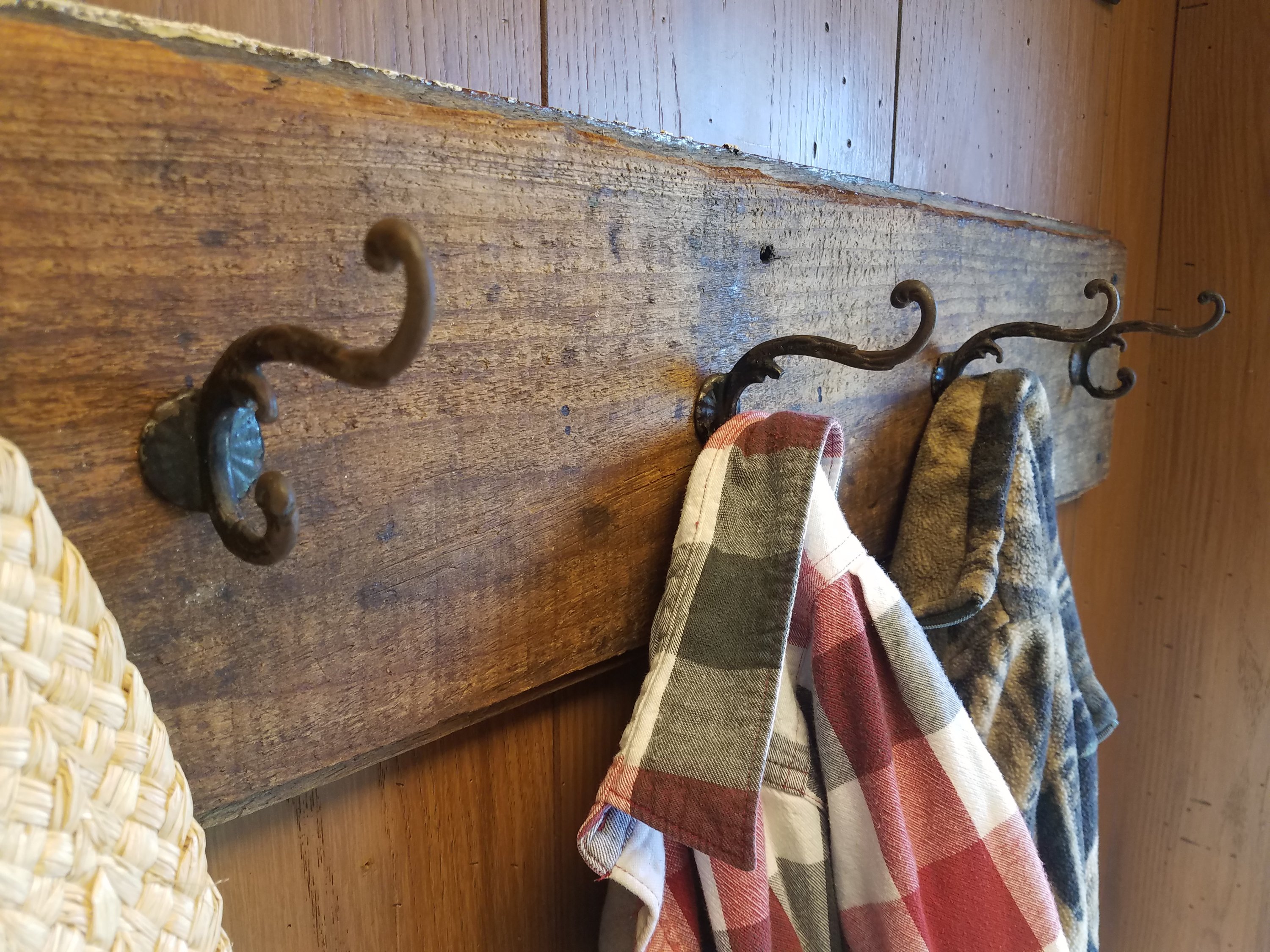 Isn’t that pretty? Just the rack here. We found a stack of nice barn boards in the back barn (there are several outbuildings on this property, one cute little guy that even used to be a milk house for selling milk- think “she shed” in the future!) We cut the board to the right width and added a sealing wax. This darkened it and brought out the rustic-ness (totally a word) without making it shiny. Then I found some antique hooks hung all around the walls of a closet room (which I plan to be a second bathrom) upstairs. We heated the hooks up on the stove, in hopes of burning off any extra rust so that they wouldn’t run anything off onto the coats, but helped me avoid painting them a fresh black, which seemed to “new” for this project. We picked 5 hooks, one for each family member. You get 2 necessary items hung, ie one coat and one bag, or whatever. The rest goes into the closet. Mama hates clutter. And this is what we ended up with.