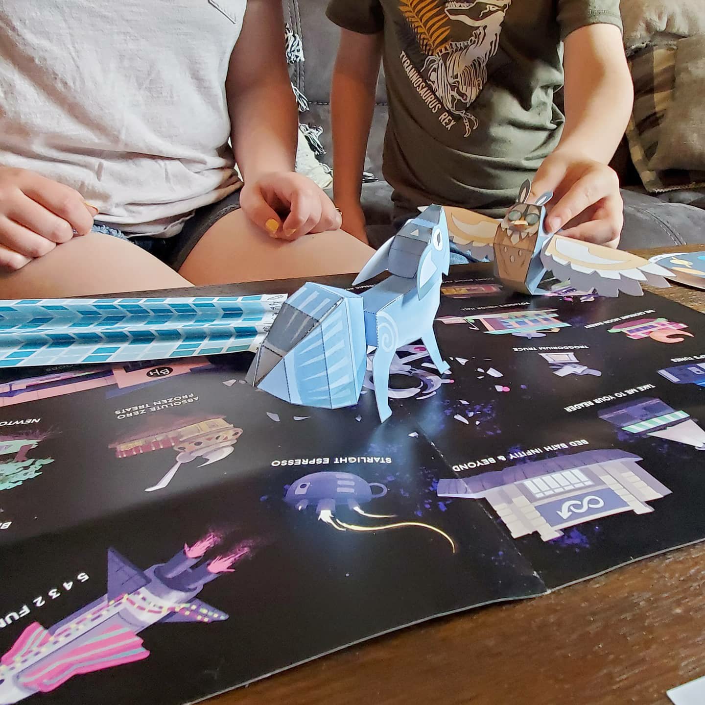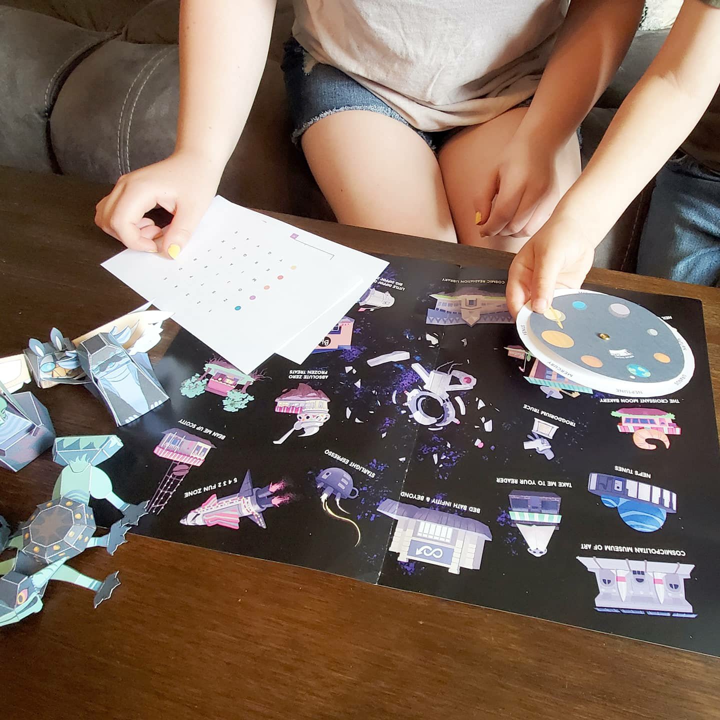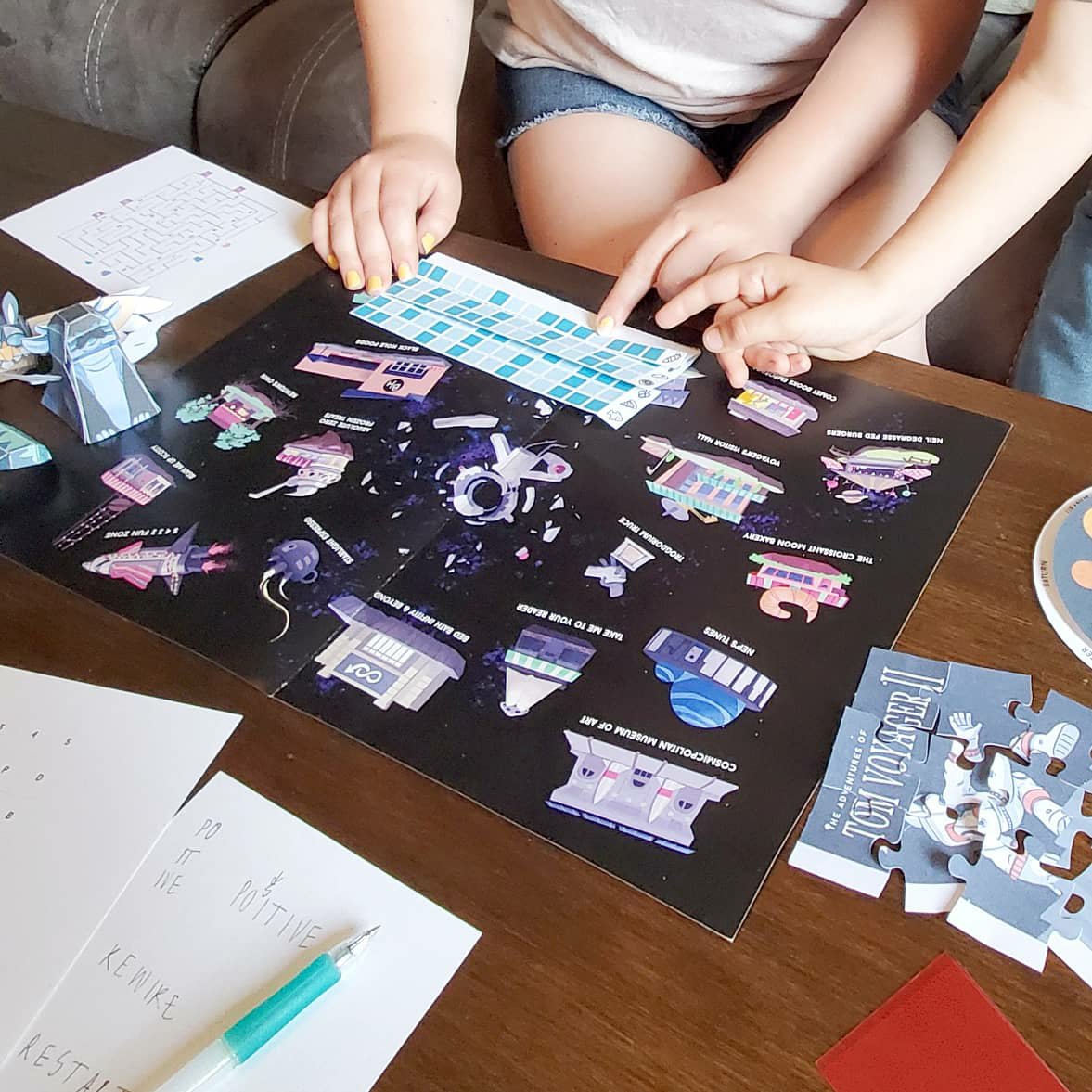 We recieved a packet with a map, puzzles, and clues. You get started by texting the abandoned astronaut lost in another dimension. She texts back and asks for you help. She gives you clues, helping your family work through the puzzles and brain teasers in order to find the information that will help to return her to Earth.