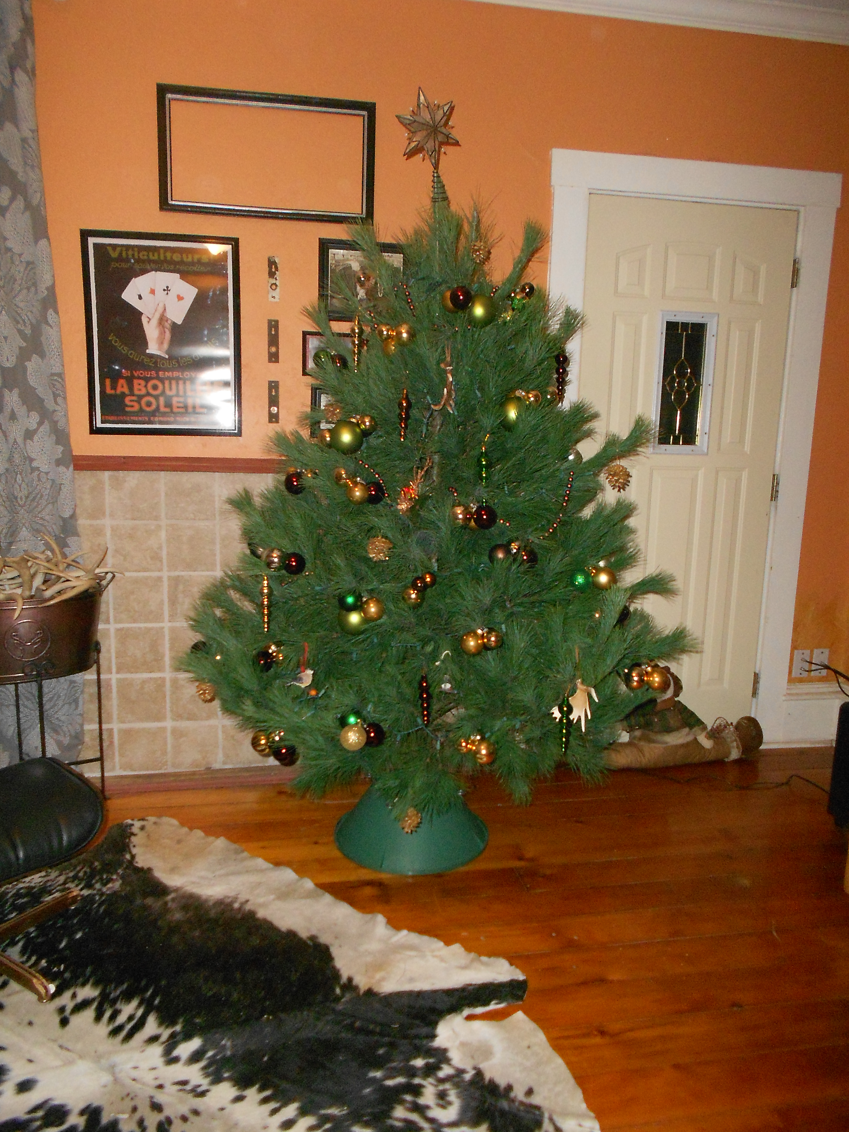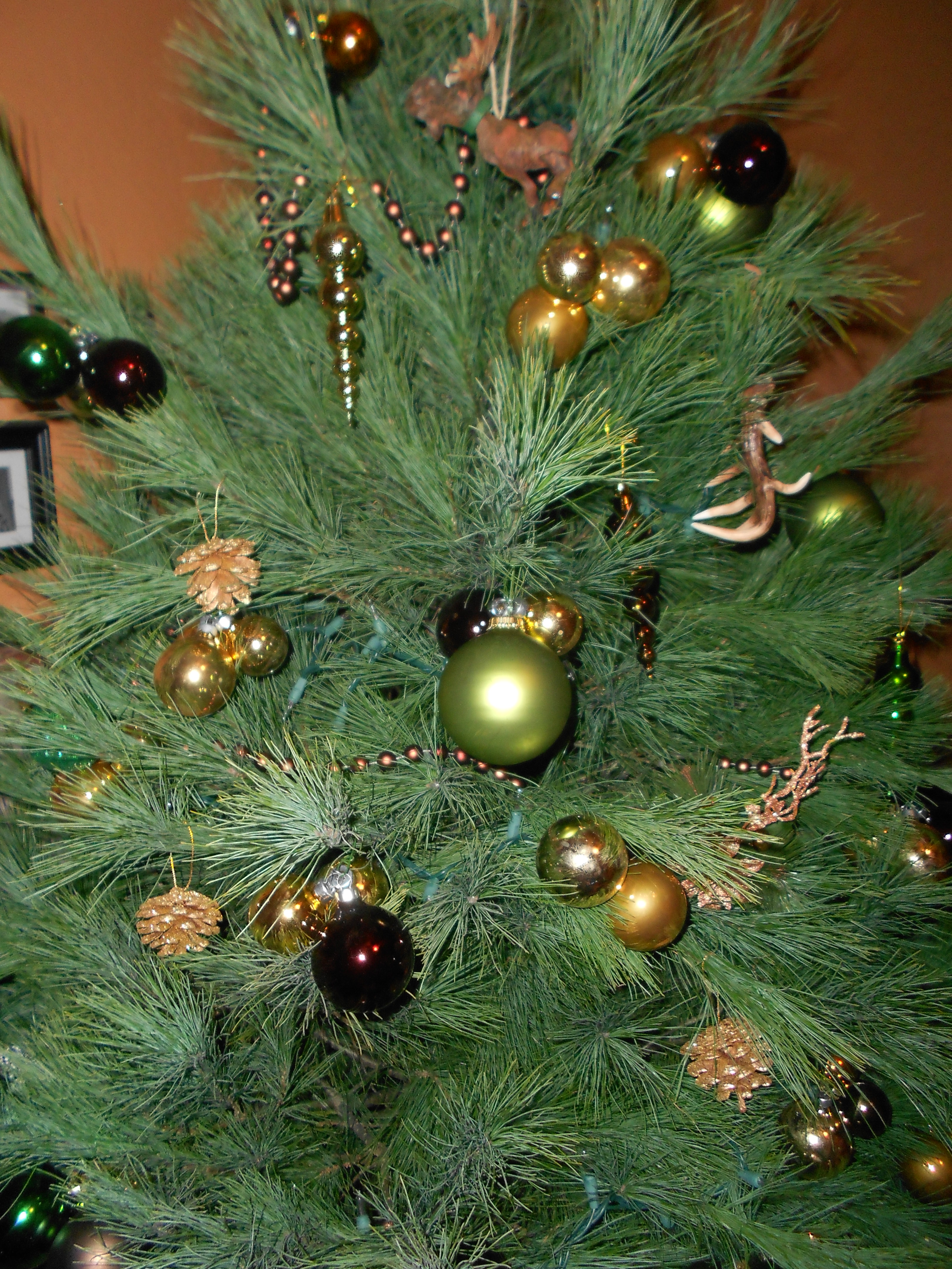 So, here are a few of our first tree together! (we did eventually find the perfect green skirt! ) We went with a bit of a “camo” theme with colors this year. That was my nod to Jeremy. We used golds and greens and bronzes on the tree. My photos don’t seem to do it justice, but it was really pretty.