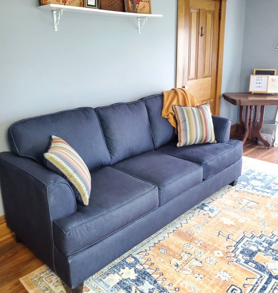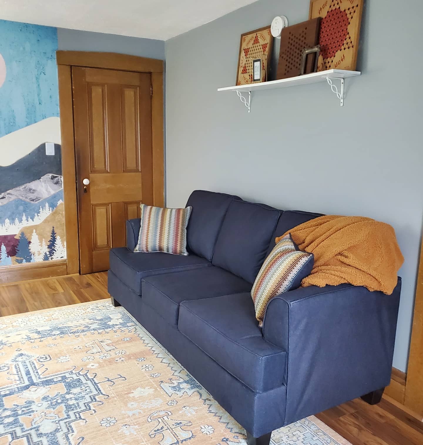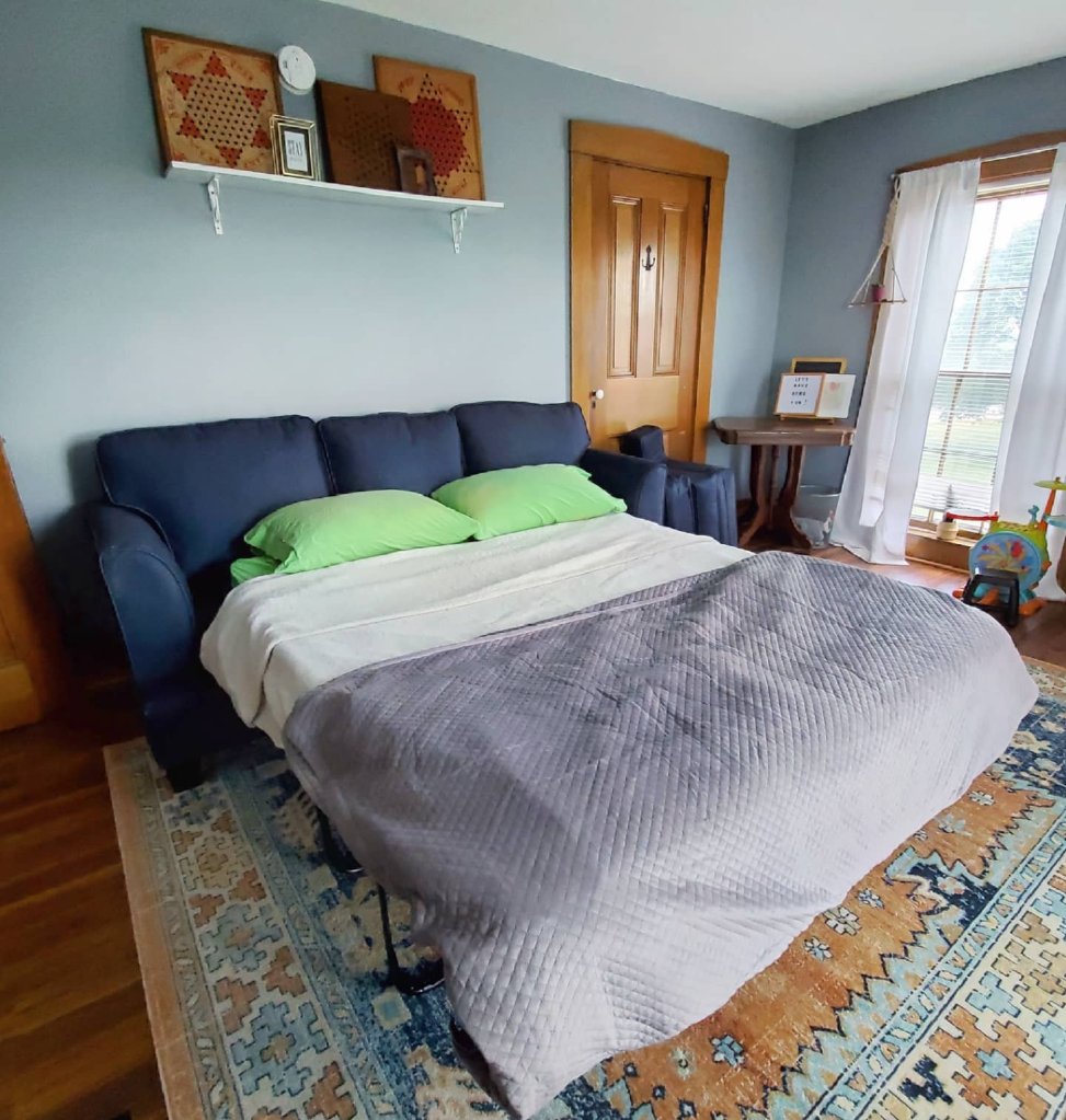 What is the best way to keep the space usable for playing while also functional for housing guests?! A sleeper sofa, of course!