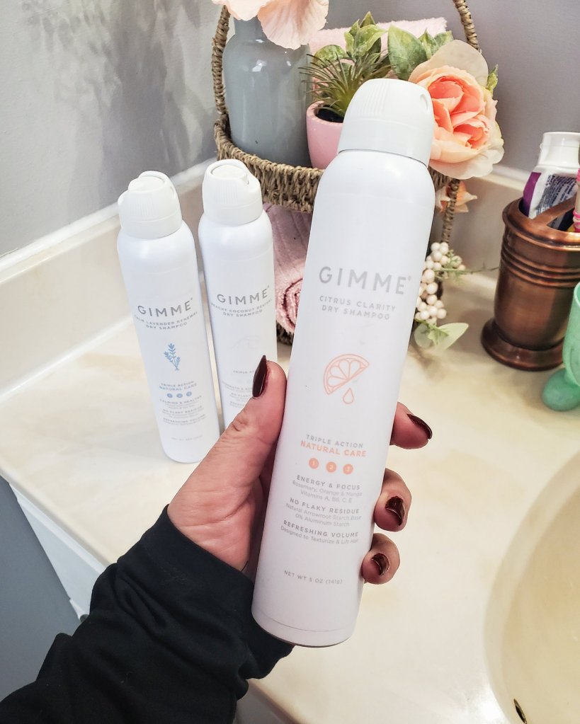 Gimme Beauty dry shampoo is my favorite. They use safe and natural ingredients, like arrowroot, and it leaves my hair soft and fresh. They have a citrus to pick you up the morning, a coconut with UV protection for daytime, and a lavender scent to be calming at night. I truly love them all.