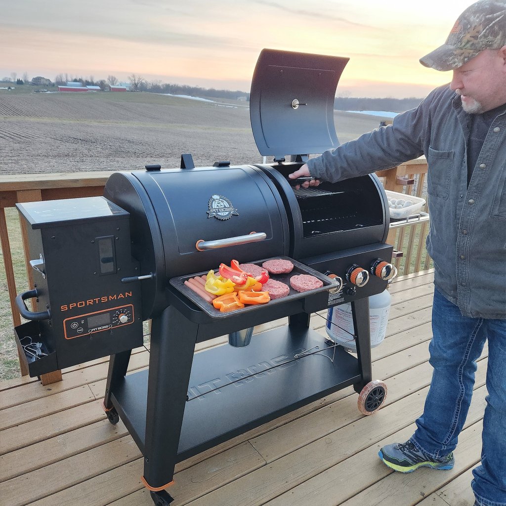 We got the Sportsman 1230 Wood Pellet Gas Grill combo. This beauty can smoke, bake, braise, roast, grill, barbecue, char-grill and sear, all in one machine!
