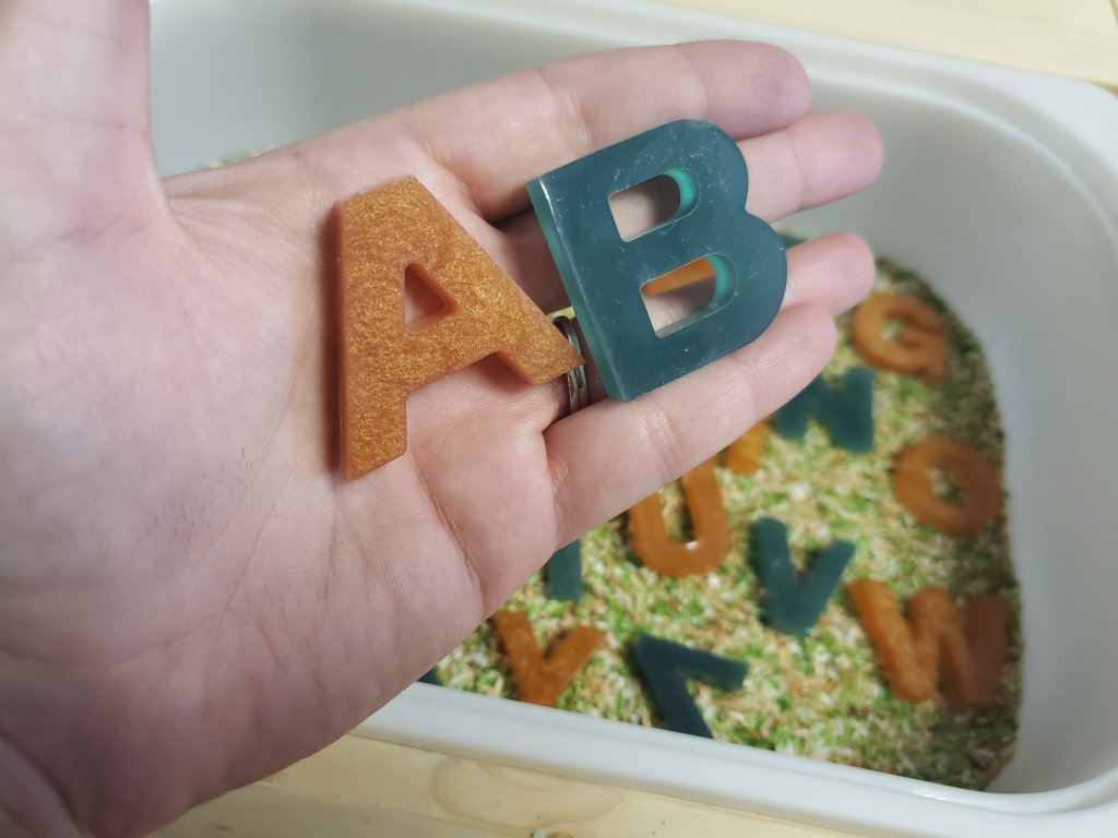 These are so fun because she adds acrylic letters and numbers that she makes! We got an alphabet that she customized to a camo theme! We also got one of her winter jars and a rainbow number jar. The boys LOVE them all!