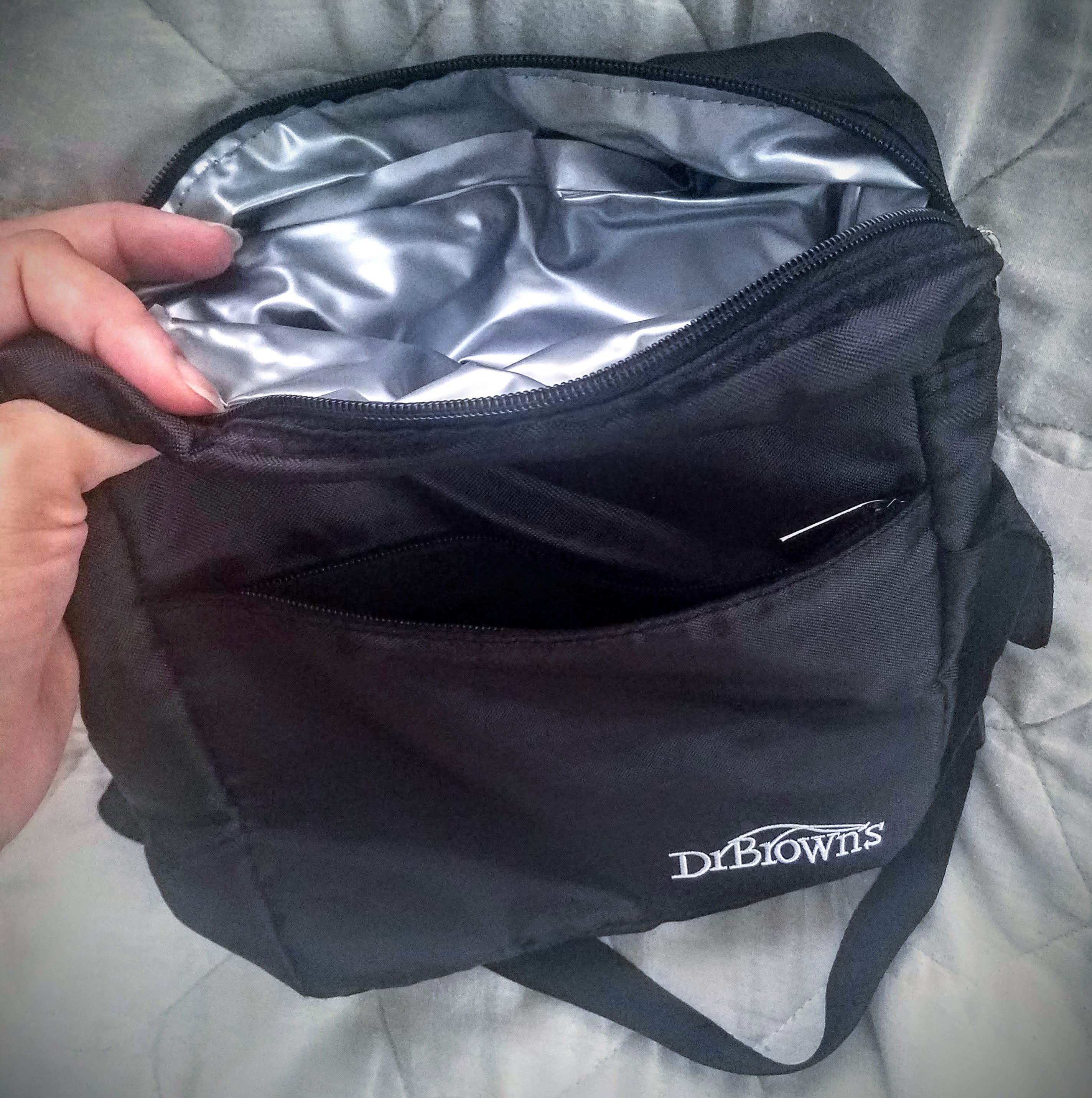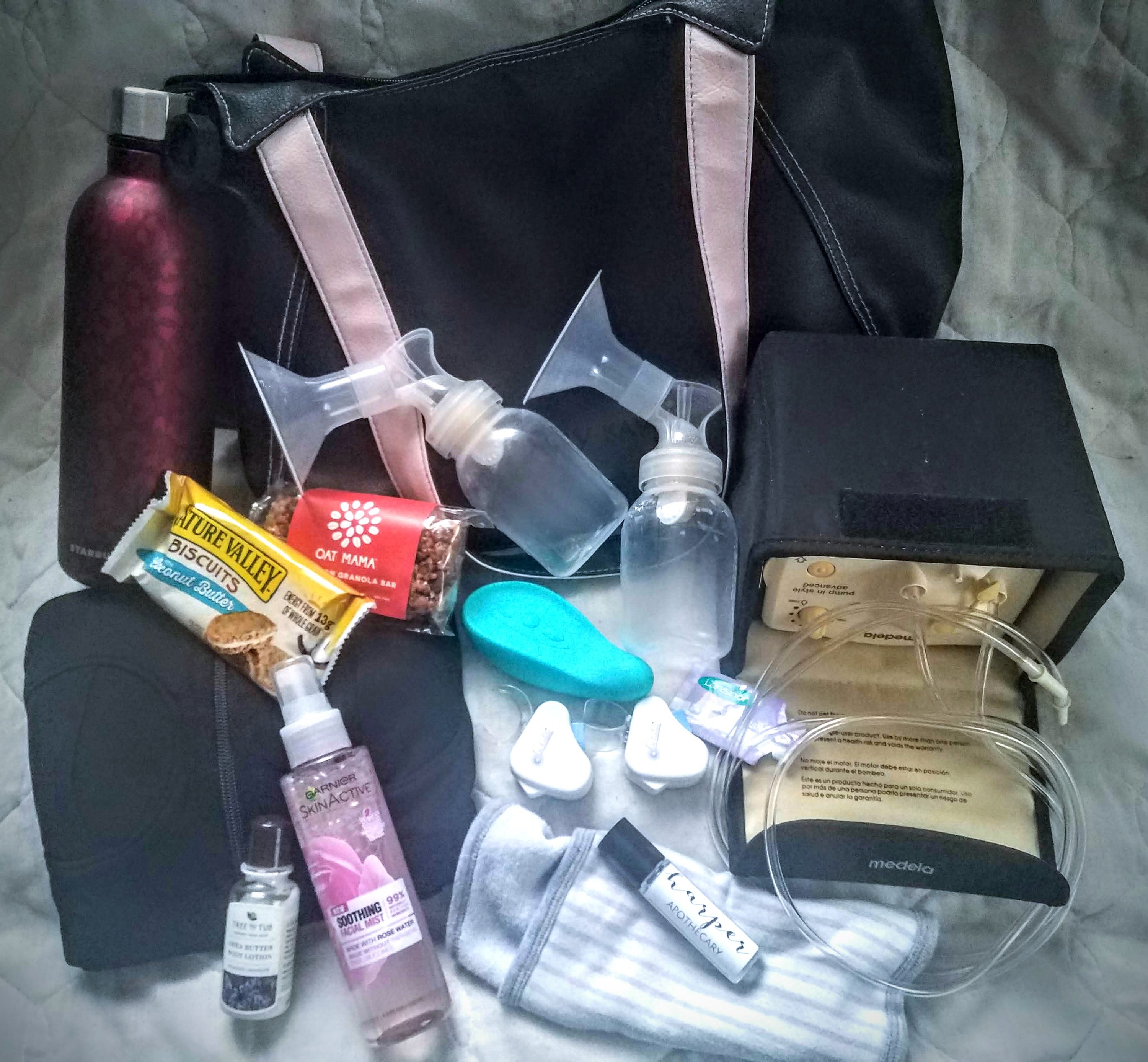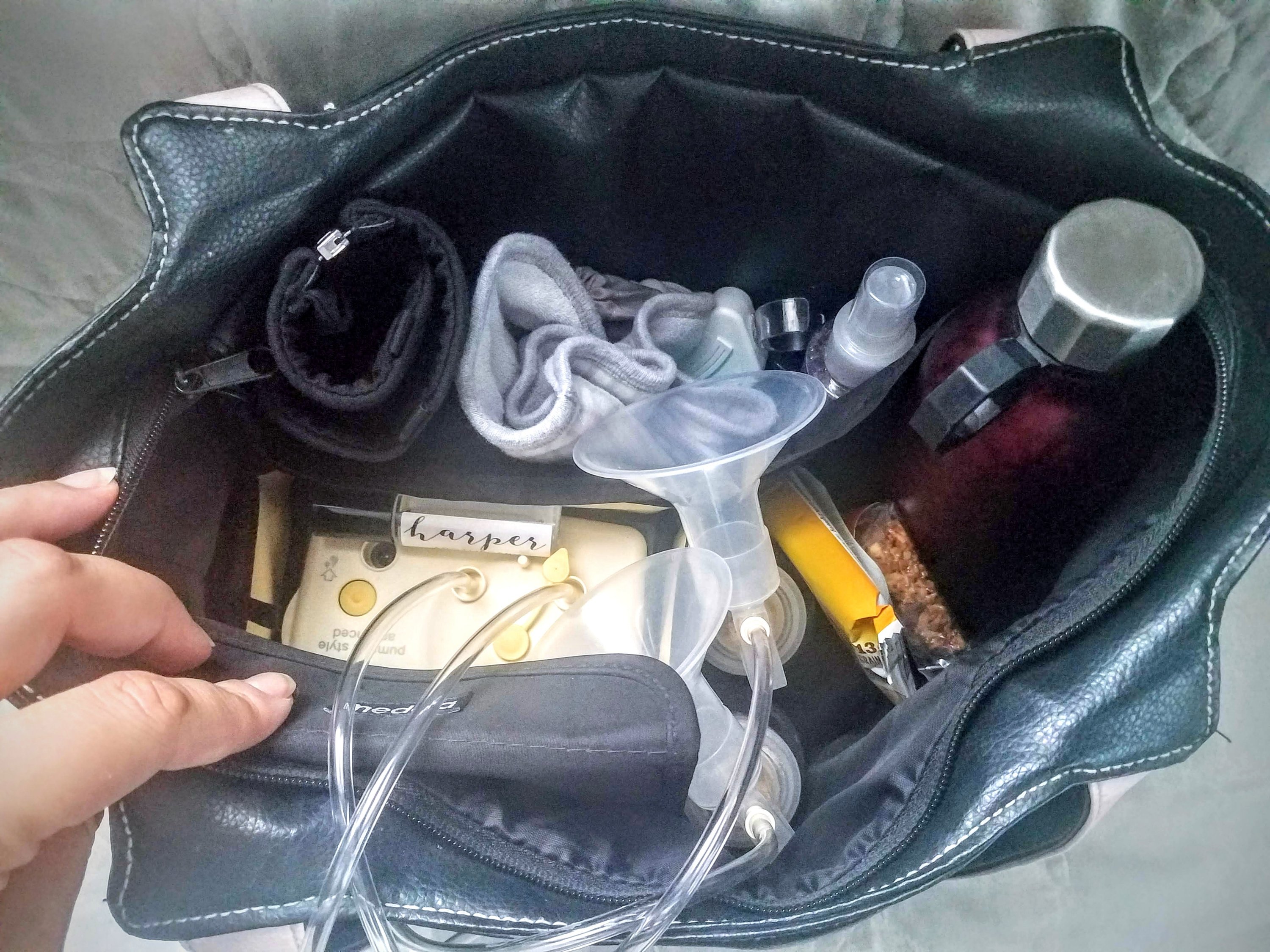 I dont carry spare pump parts, although it’s sometimes wise. I keep a few things like new membranes at home. When I am out for work I know that fortunately Medela stuff is carried at stores around me if an emergency ever arises. I used to carry a Haakaa pump for use while feeding on the other side when I was first starting out and often engorged. A manual pump is often also a good idea to carry or at least own in case of electricity outages and such. We did lose power one night in a storm and I had gotten rid of my manual, thinking I never used it. I ended up pumping out in the car in the storm. I do carry 2 Avent bottles to fill and if I am going to be gone for a while or it is hot out I bring a soft cooler bag (Dr. Brown’s) with ice packs. The other times, I leave my milk in the bottles in the bag. Milk can sit out fresh for up to 6 hours. I then feed it or refrigerate it. Makes things simple.
