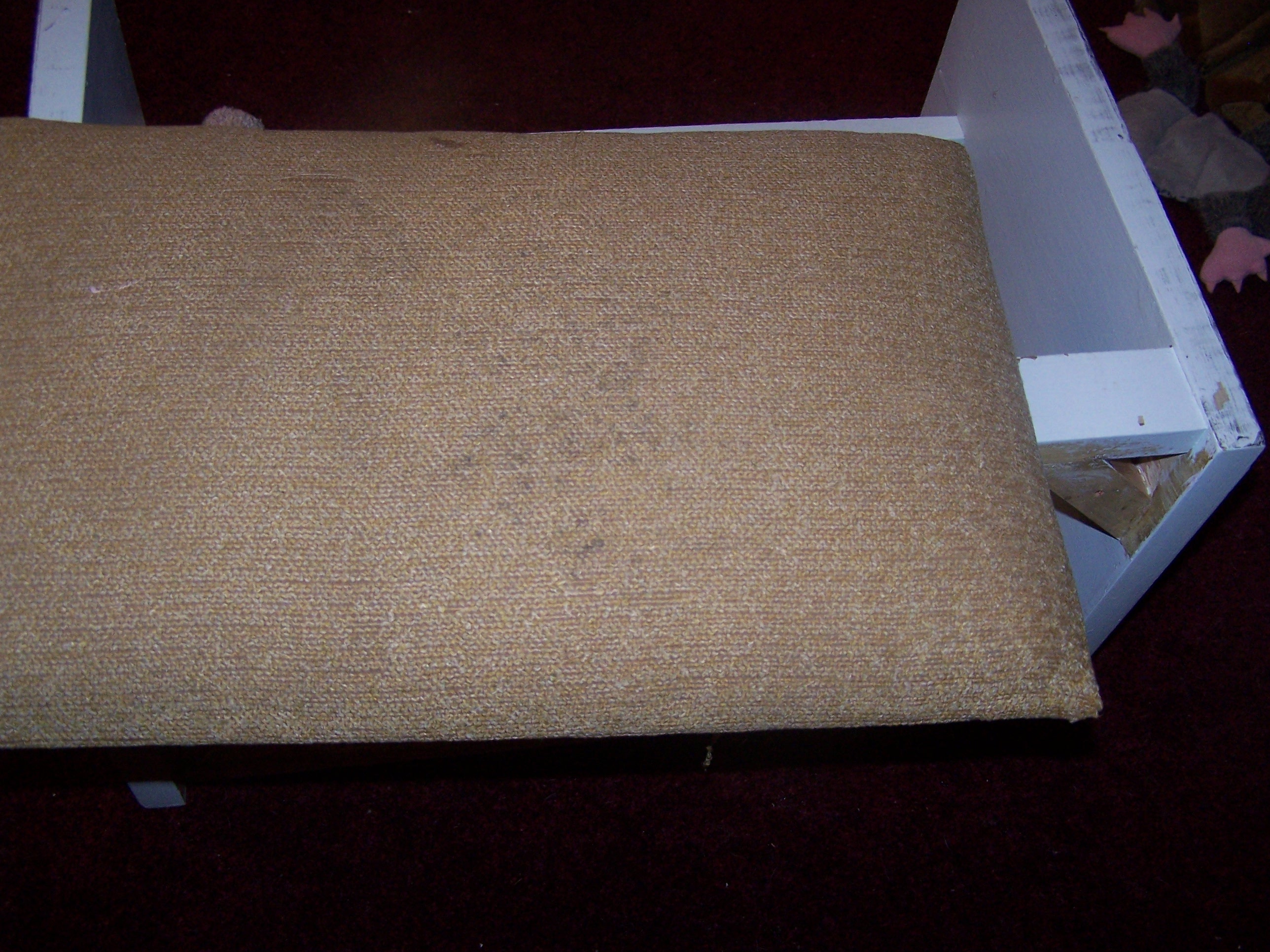 Last night I started ripping old fabric off the bench. Come to find out there was not only one layer of awful fabric, but three! Here’s the before photo: