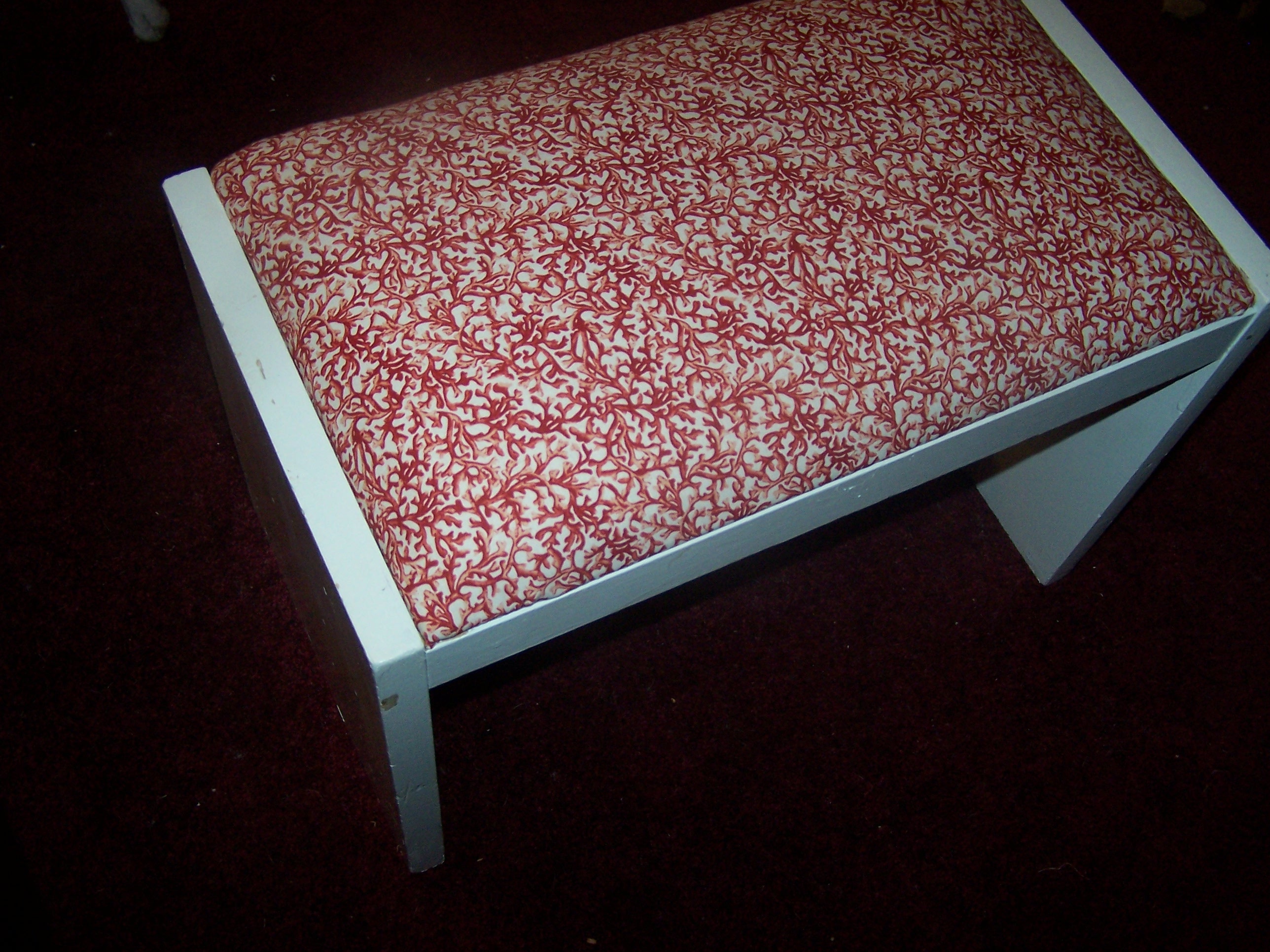 I liked the chipped white paint of the bench, so I decided to keep it. I also decided that there were too many things, including another, smaller vintage vanity seat already in the spare bedroom. I thought that the front porch could use something, so that was to be the new home of the bench. We have a small, white ice cream table and two chairs on the porch, but nothing else so far. The white would be a perfect match. I have also had my eyes peeled for some of those vintage metal lawn chairs. I want two of them in red, or to paint red. That helped me make my choice for fabric. I chose a white material with a red coral pattern.