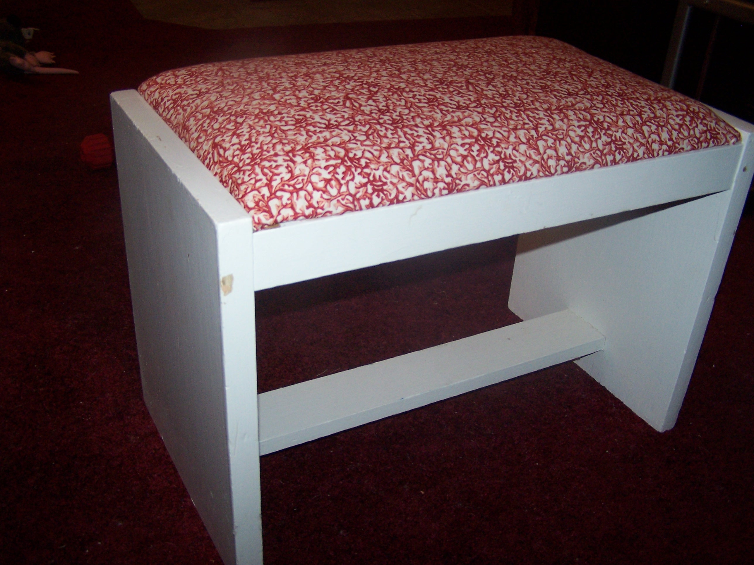 When we first moved into our new house Tony and I bought a vintage vanity on Craigslist for $20 to go in our spare bedroom. The vanity is used to hold all of my “get ready in the morning stuff”. The vanity came with a little vanity bench. The problem was that the bench didn’t match the vanity. The bench was painted white and had obviously been recovered with some purple material. I had thought about painting the vanity a shabby white, but that wouldn’t solve the whole problem. The styles and sizes of the vanity and the bench didn’t even match. So, I put the bench up for sale on Craigslist, again. After a couple of weeks the bench still hadn’t sold. Well, another project for me!