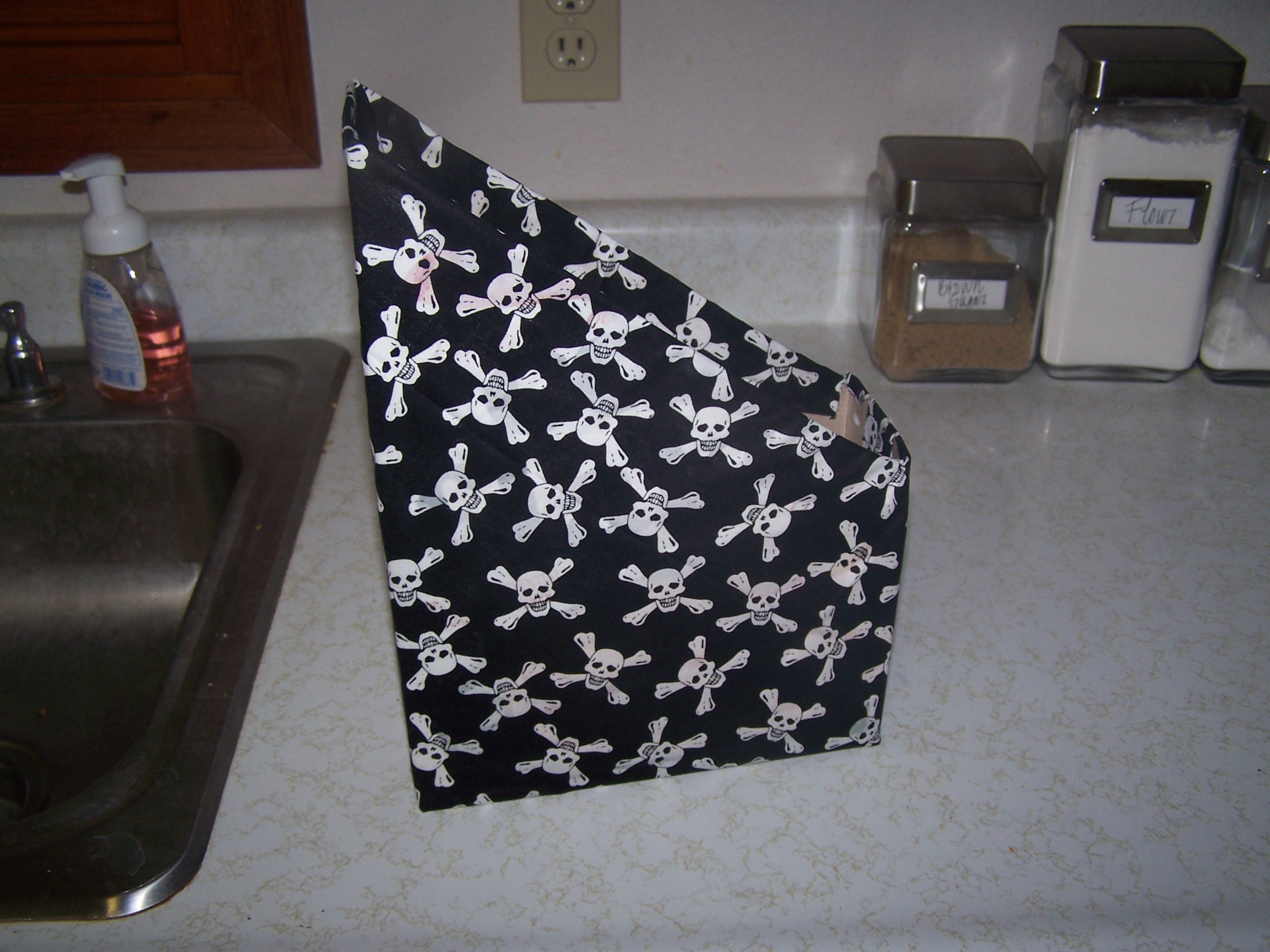 I cut the cereal box top off and cut the sides on an angle. I then recovered the box by glueing some black and white skull material (I have a thing for skulls right now) over all outter sufaces. It was easy and cheap and I think it goes well in the office space. Now I have one more storage box. More to come in the future.