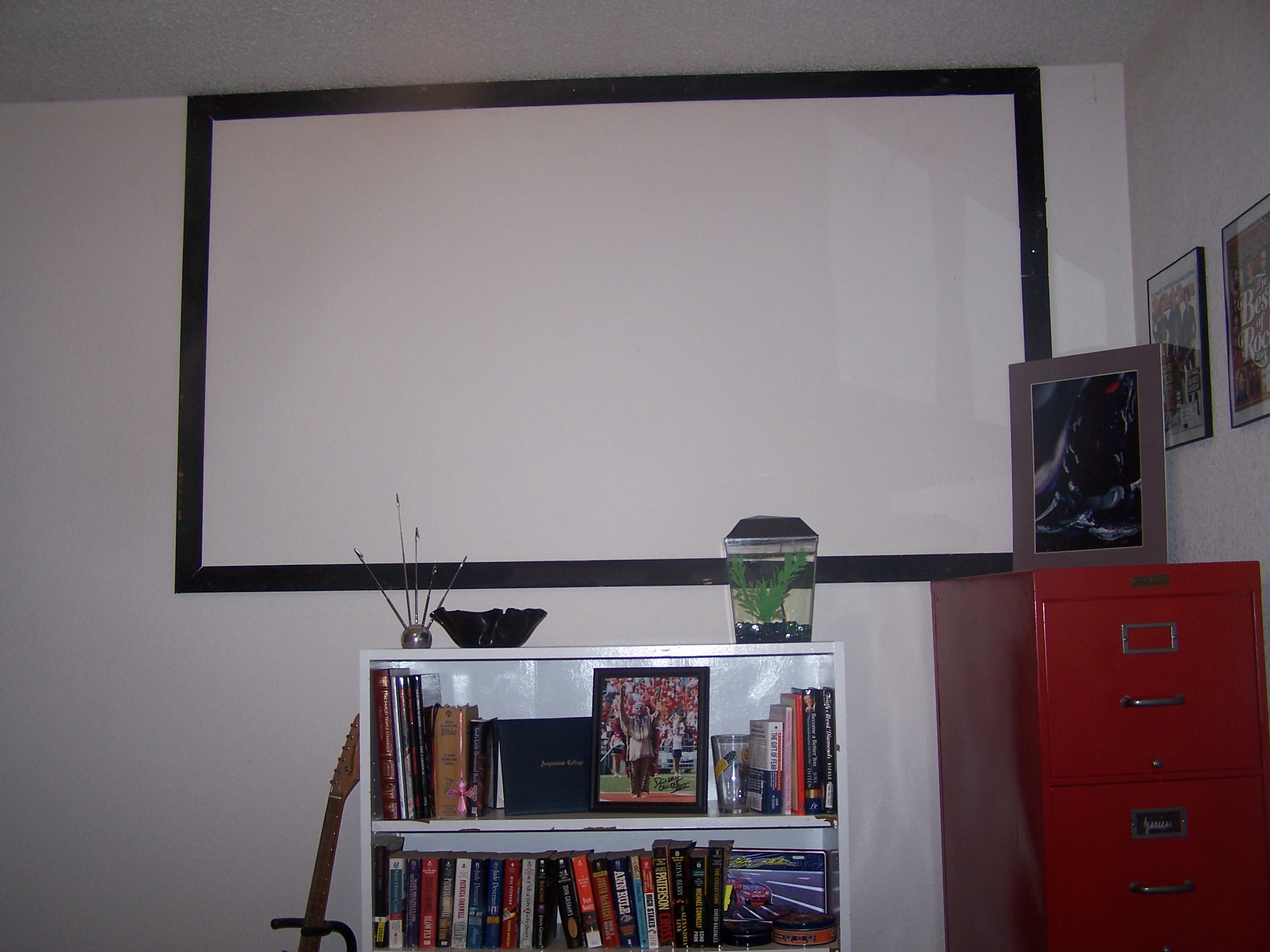 Also, another little office update. Tony finally installed the frame for the projector picture. The wall at least appears empty for a reason now. I kind of like it. It almost looks a little purposefully quirky when the projector isn’t on.