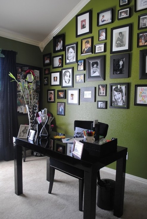 I’m not a huge fan of green walls, but I love the black frames in this office.