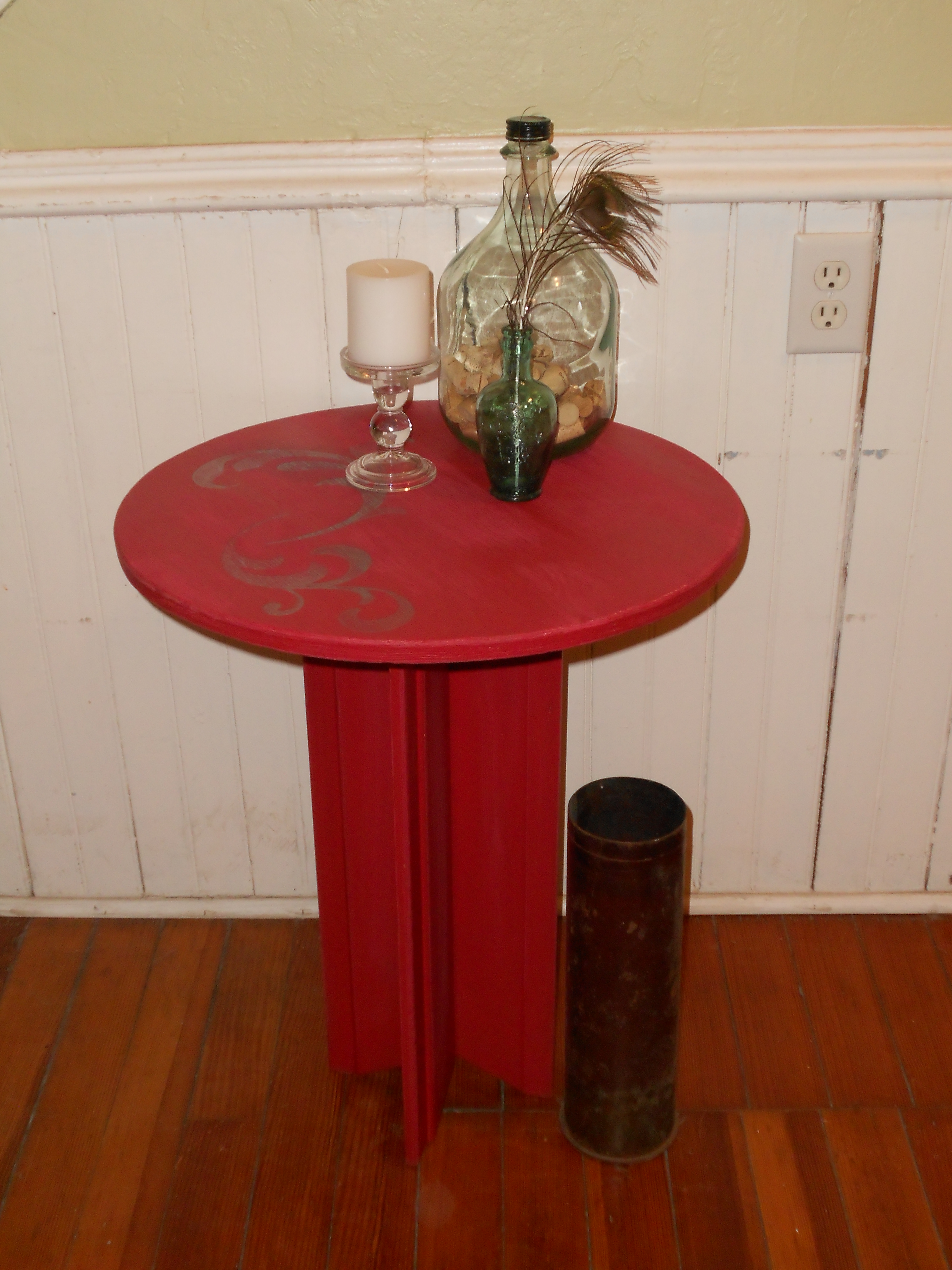 Shabby, yes, a bit. But, I loved the round shape and primitive pedestal. So, I patched, sanded and painted. I picked a burgundy-ish color and then I stenciled my favorite paisley on the top in silver. I thought this was a bit modern to mix with this little table. I roughed up the edges and faded out the design on the top. I think it turned out really cute!