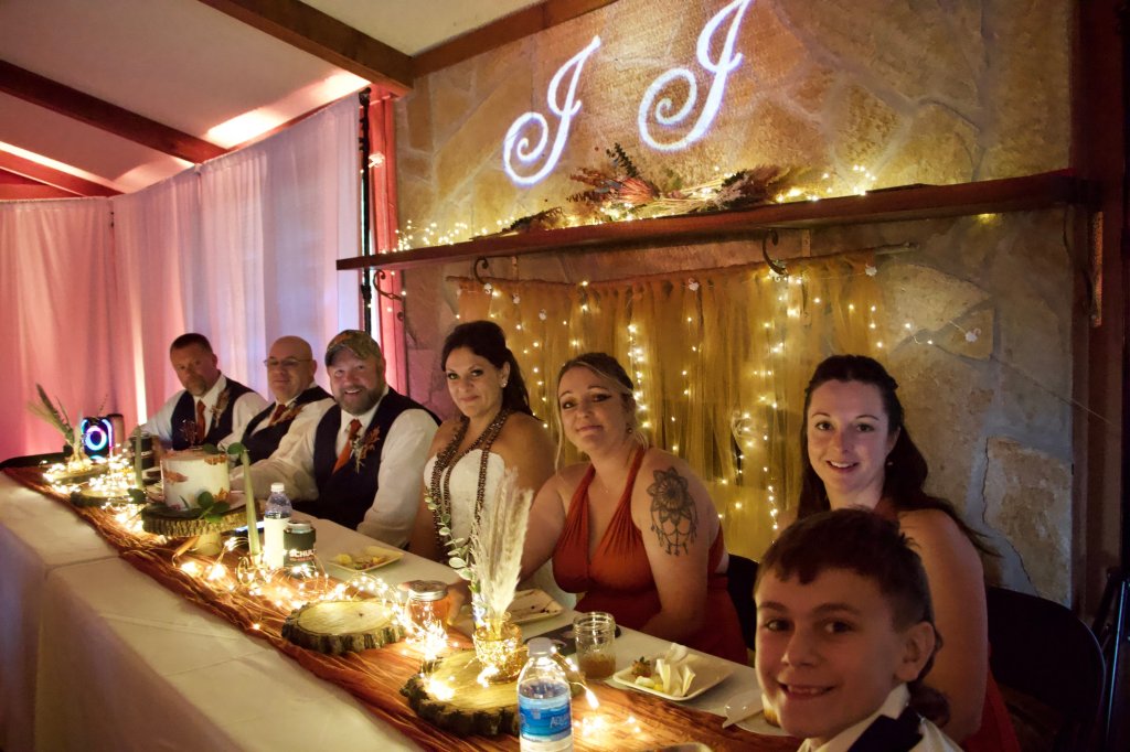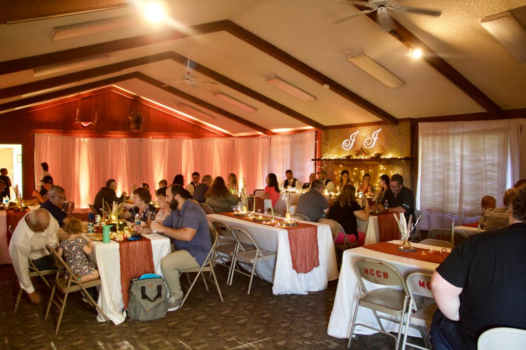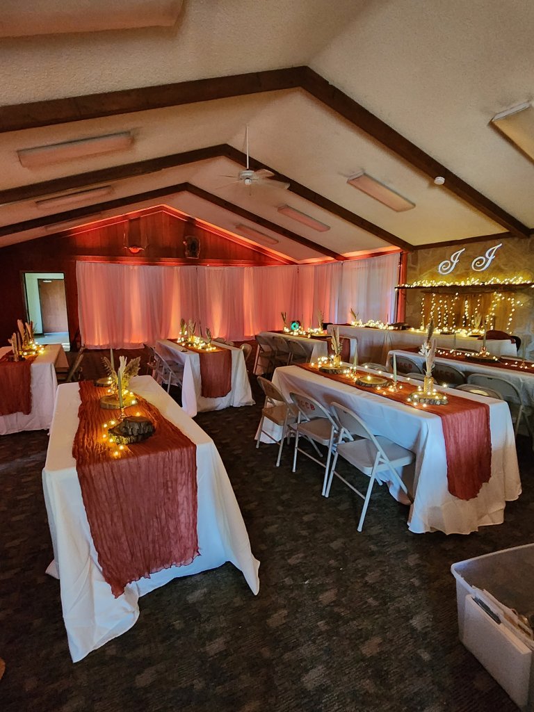 We used white drape walls and uplighting to make the glow. We also added the custom monogram behind our table. It all turned our venue into our rustic glam dream spot!