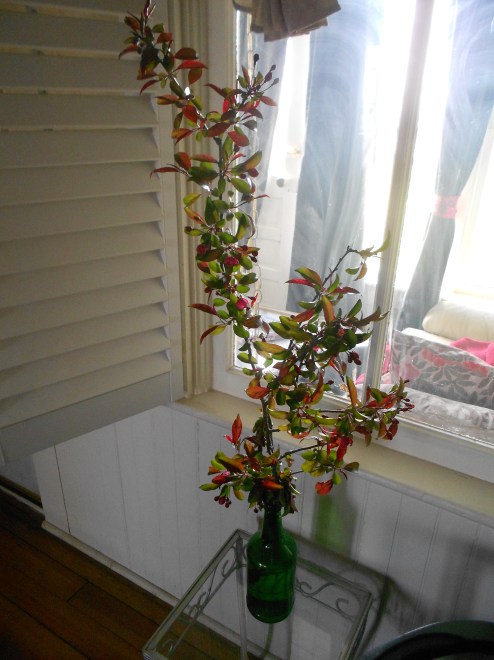 And that is only the front! Hey, we have neighbors! 🙂 There were many other trees like this all over the property, not to mention weeds that had become their own trees all around the house, barns, and outbuildings. We have even uncovered some things we didn’t know were there when we moved in!! No joke! The other day we found an old metal lawn chair set up by a cattle shoot. They had made a shooting range down there and we couldn’t even see it! We found an old wheel borrow with what used to be flowers planted in it, various pieces of junk, both useful and non, and even learned we have an old hand-pumped well! And it works! Yea, so anyways, on to the fun part. With all of this hard work I just knew there would be some enjoyment in the end. Trimmed branches and a wine bottle…