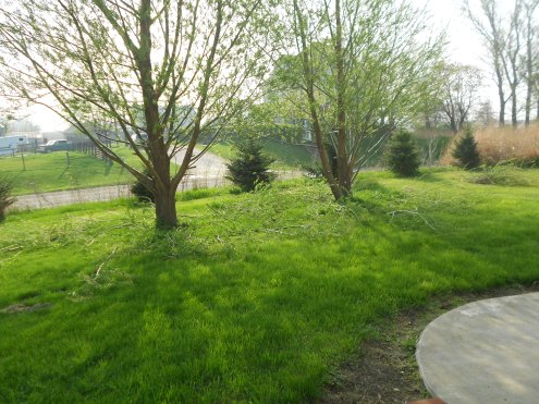 We inherited a lot of yard maintenance to take care of from the previous owners. I mean A LOT. With six acres I am sure that some of that is inevitable, but this is just over the top. The must have never done yard work once while they lived here. Never. The weeds, even in the close to the house areas, were over my head. The trees had split and grown funky many years ago. The rock garden was more like a dirt pit scattered with rocks. Need I go on? So, point being, this is our first spring here and we have been putting in a lot of hard work out there. I can’t wait to get a new shipment of rock and show you how the “for now” patio area is coming. But, for right now I thought I would show you just how much tree trimming we accomplished the other day.