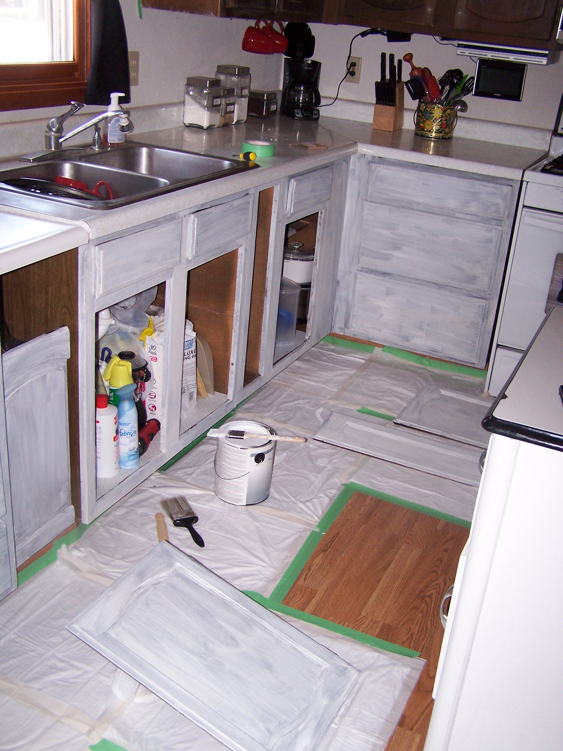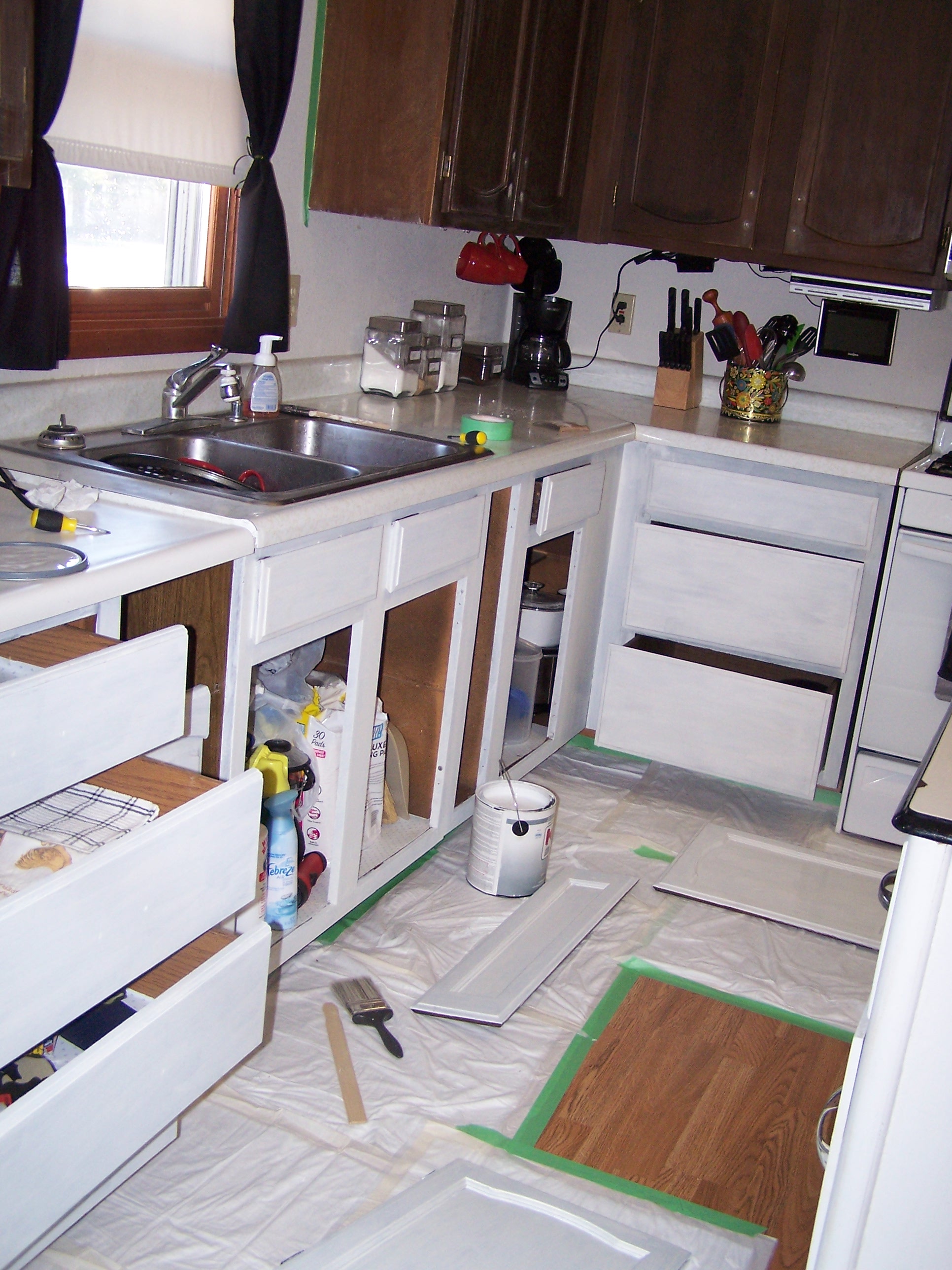 We have been hard at work painting those kitchen cabinets. Not finished yet, but getting close. I just thought that we would update you on some of the process and the progress.