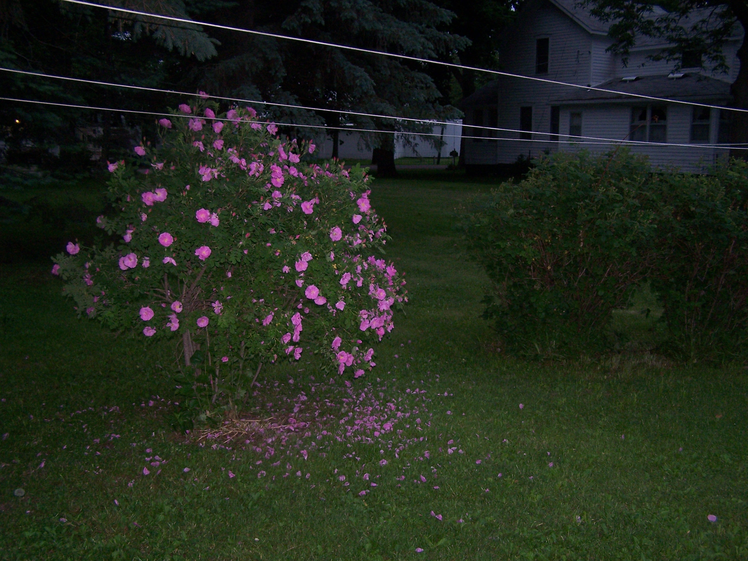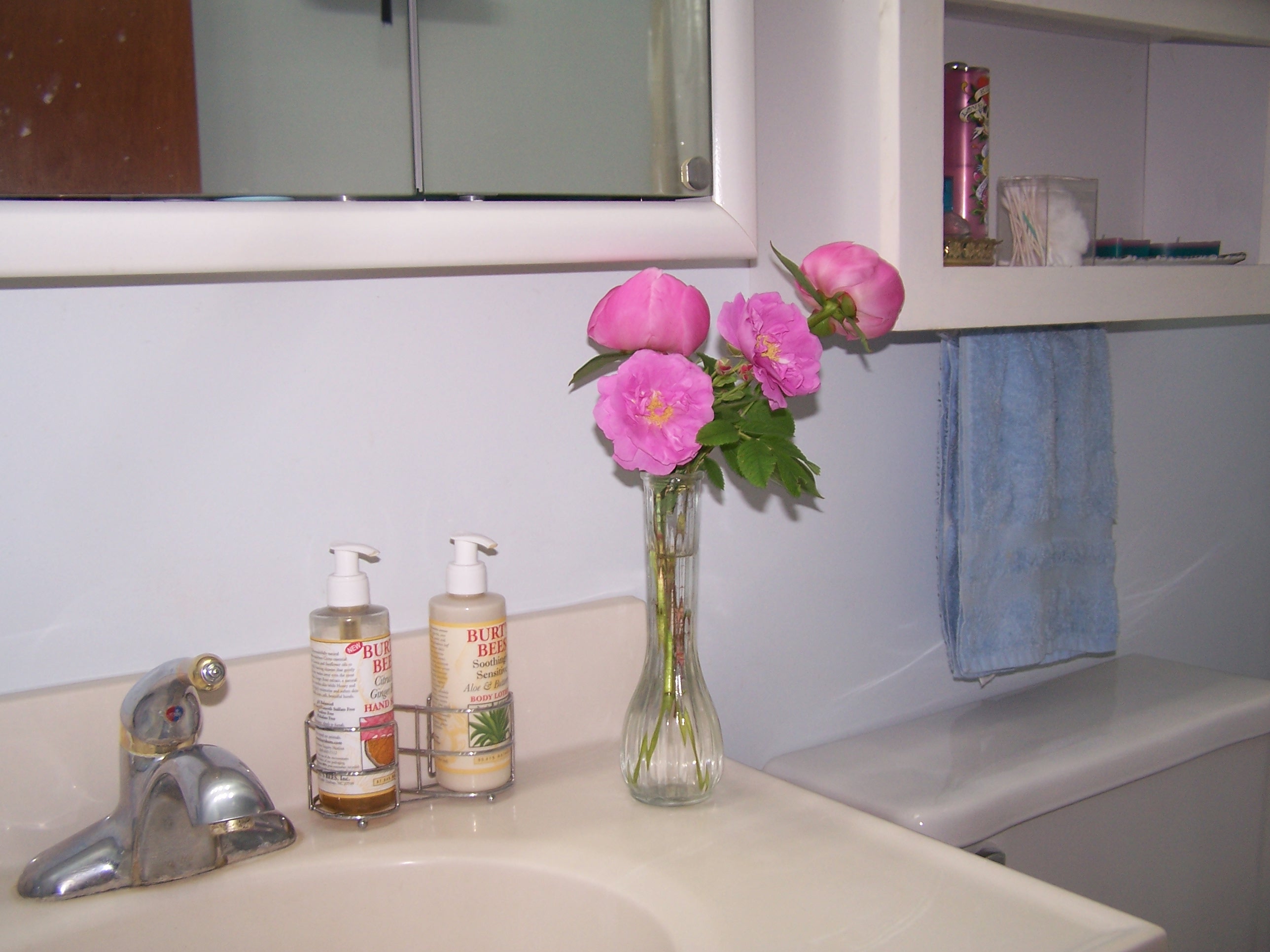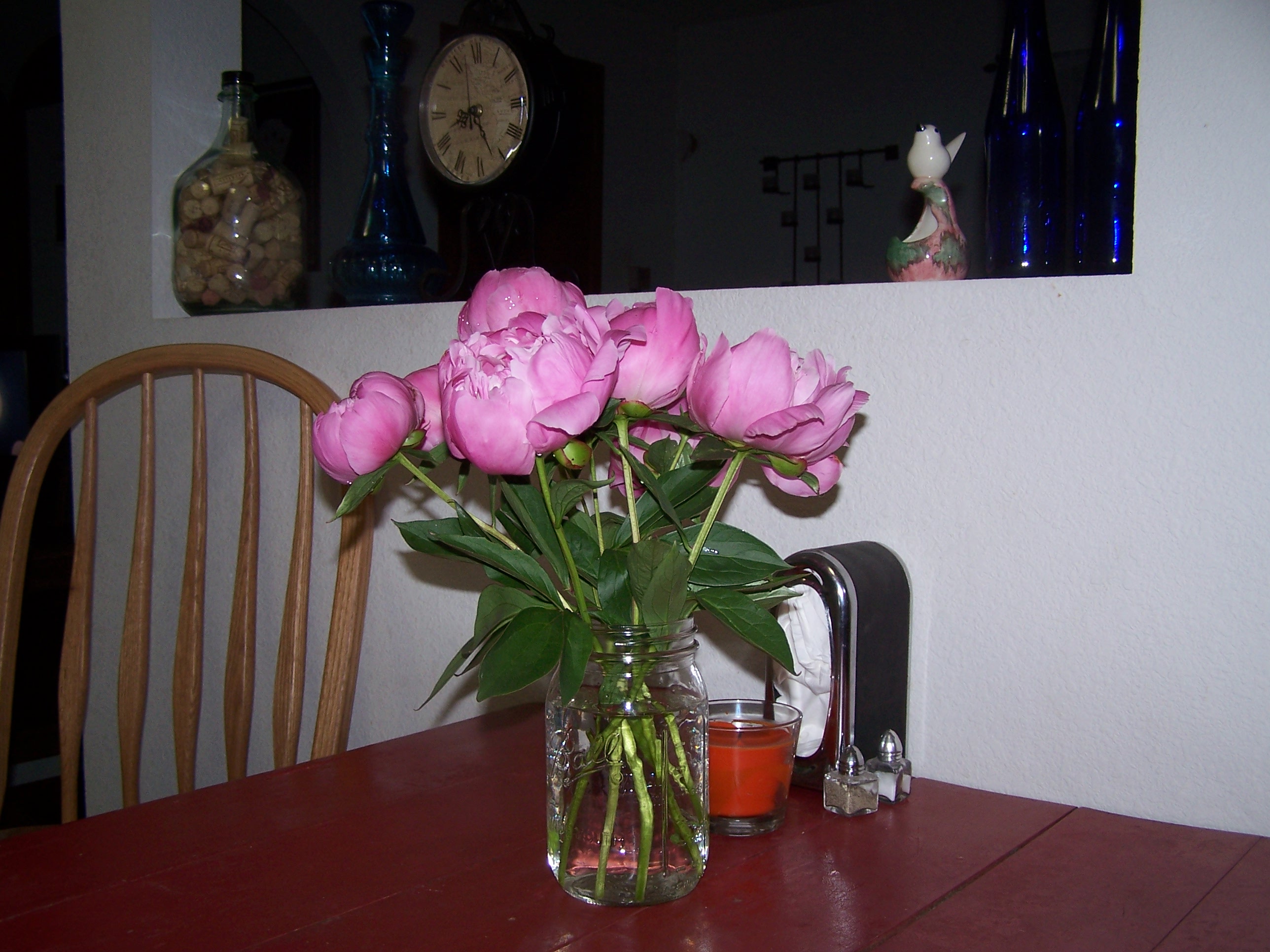 And, on a prettier note, our peonies are in bloom! Another bush of pretty pink flowers is also in bloom, which I think might be a kind of roses. Here is a shot of the rose bush and the bouqet we cut for the table and even some for the bathroom. They smell great and you gotta love a free touch for the home! 🙂