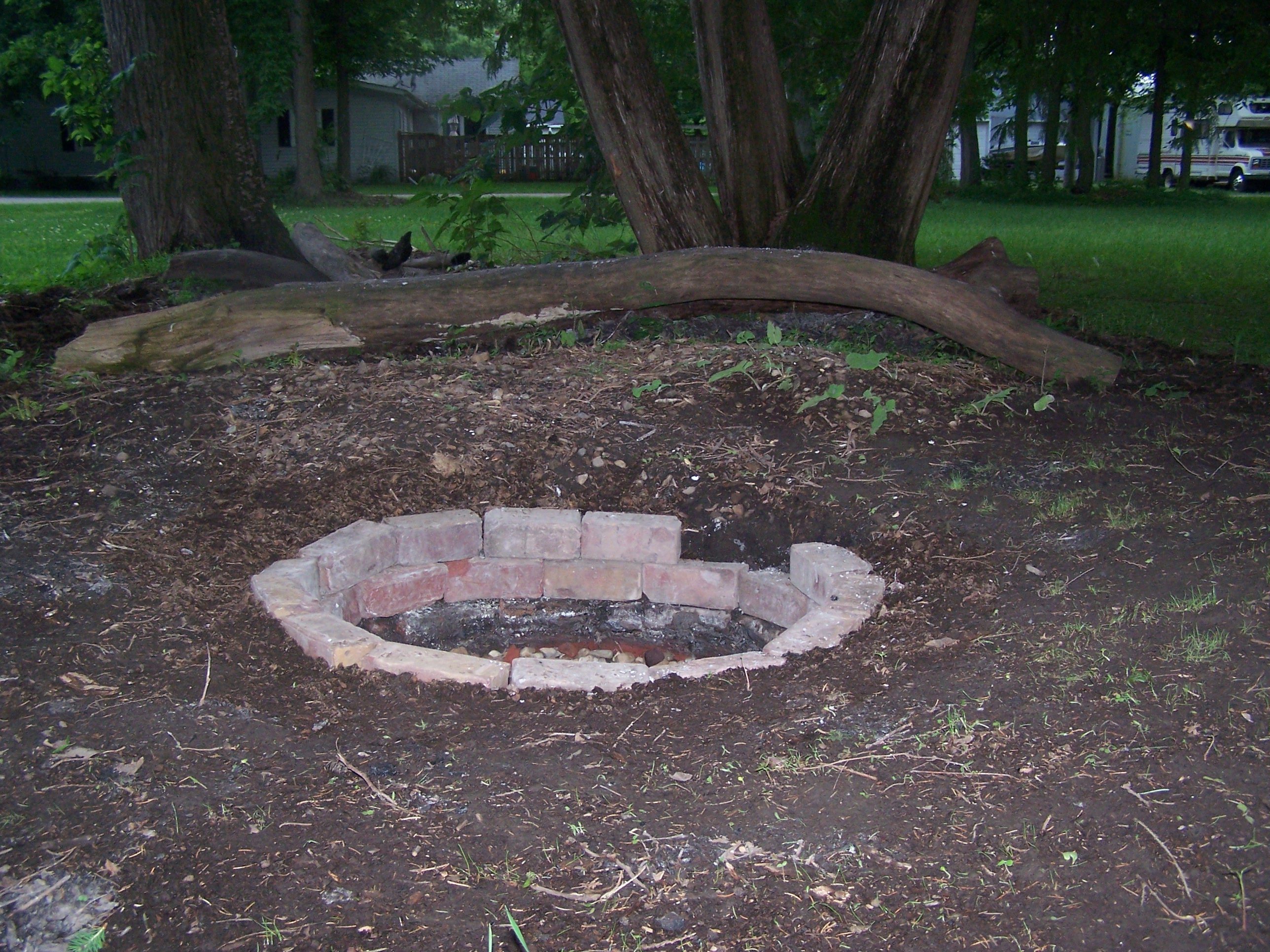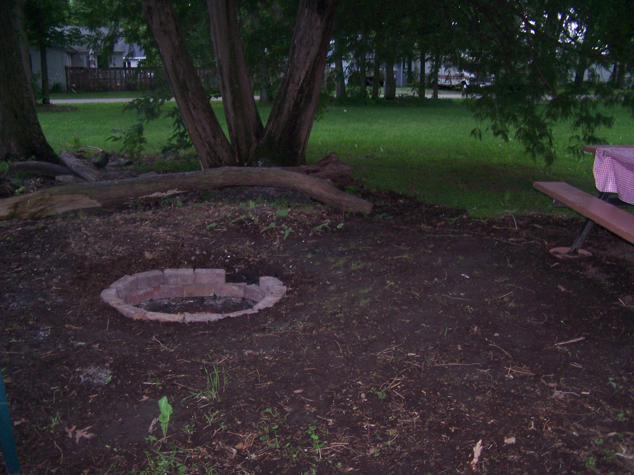I picked up a few bricks yesterday and we finally got to work on finishing the fire pit. Yes, we are short by exactly one brick (not a bad guess!), but that will be taken care of next weekend. The bottom two layers which we laid a while back were now settled in mud and ash since we have been using the unfinished pit. After much digging and playing the mud we finally had them all arranged and neatly packed in. We cleaned out the bottom and laid a few rocks. What a difference! And, grass is poking up where we put grass seed already! We were so excited! Maybe there will already be some green out there in time for the party! I’m hoping it is strong enough be then so we don’t crush it all!